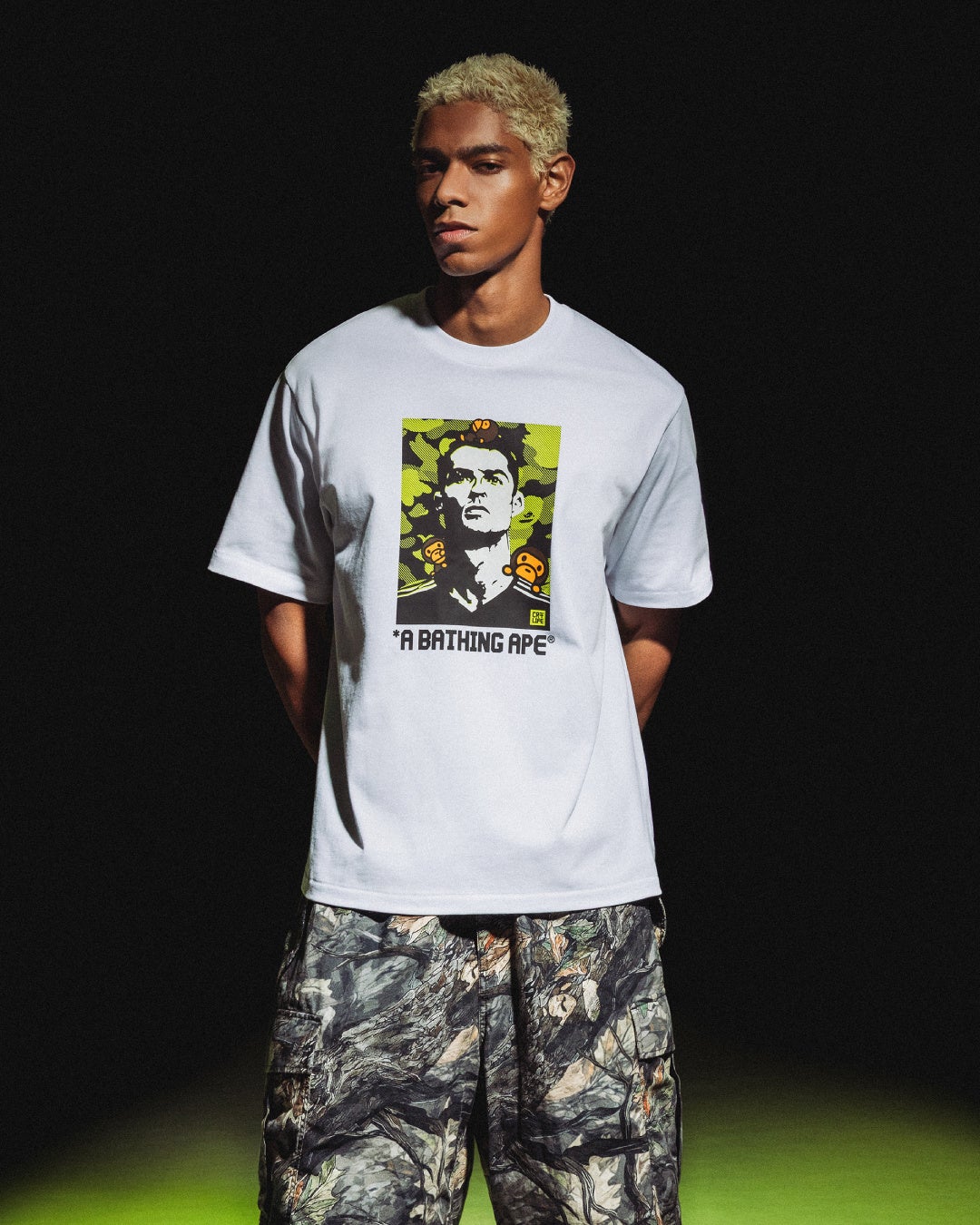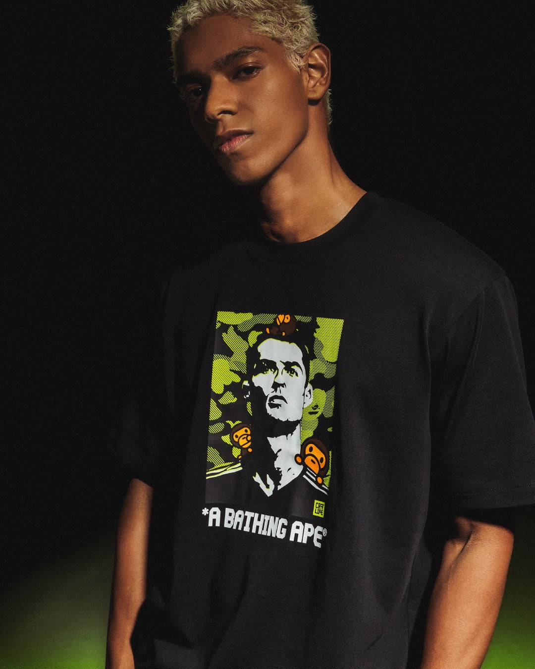 本コレクションは、フットボール界のレジェンド、クリスティアーノ・ロナウドの卓越した功績を称えるものであり、BAPE®の大胆なデザイン哲学と、史上最高のアスリートのひとりとして知られるロナウドの揺るぎない信念を融合させた内容となっています。