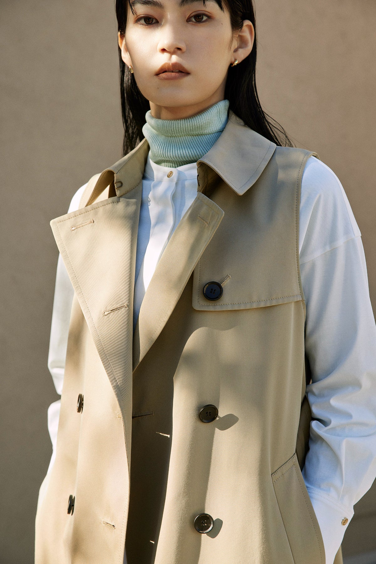 デザインはトレンチコートの袖を無くしたジレタイプ。本格的な雰囲気を保ちながらカジュアルに羽織れるバランスを追求しました。長めの着丈と自然なAラインシルエットが生み出す優雅なドレープ感により羽織った際の美しさを引き立てます。エポレット(肩章)、チンフラップ(※1)、背面のアンブレラヨークを省くことで、軽量化と着やすさを実現しました。
