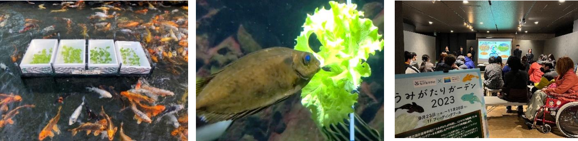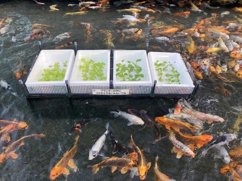 新潟県立海洋高等学校と連携し、ニシキゴイを飼育展示しているフィーディングプールで、魚の排泄物を栄養とした水耕栽培である、アクアポニックスを実施します。