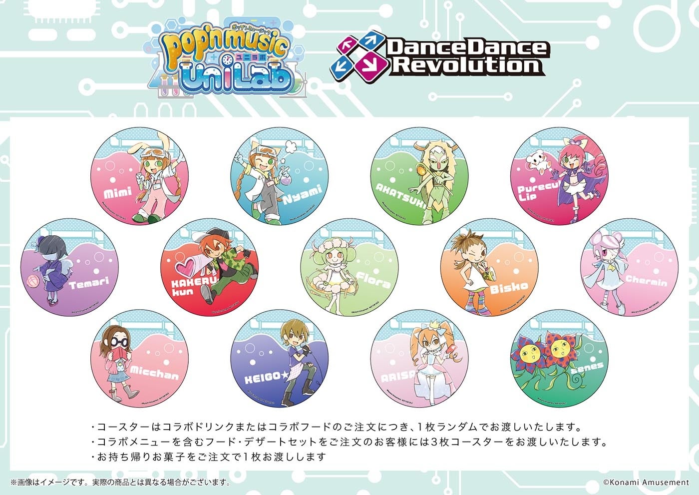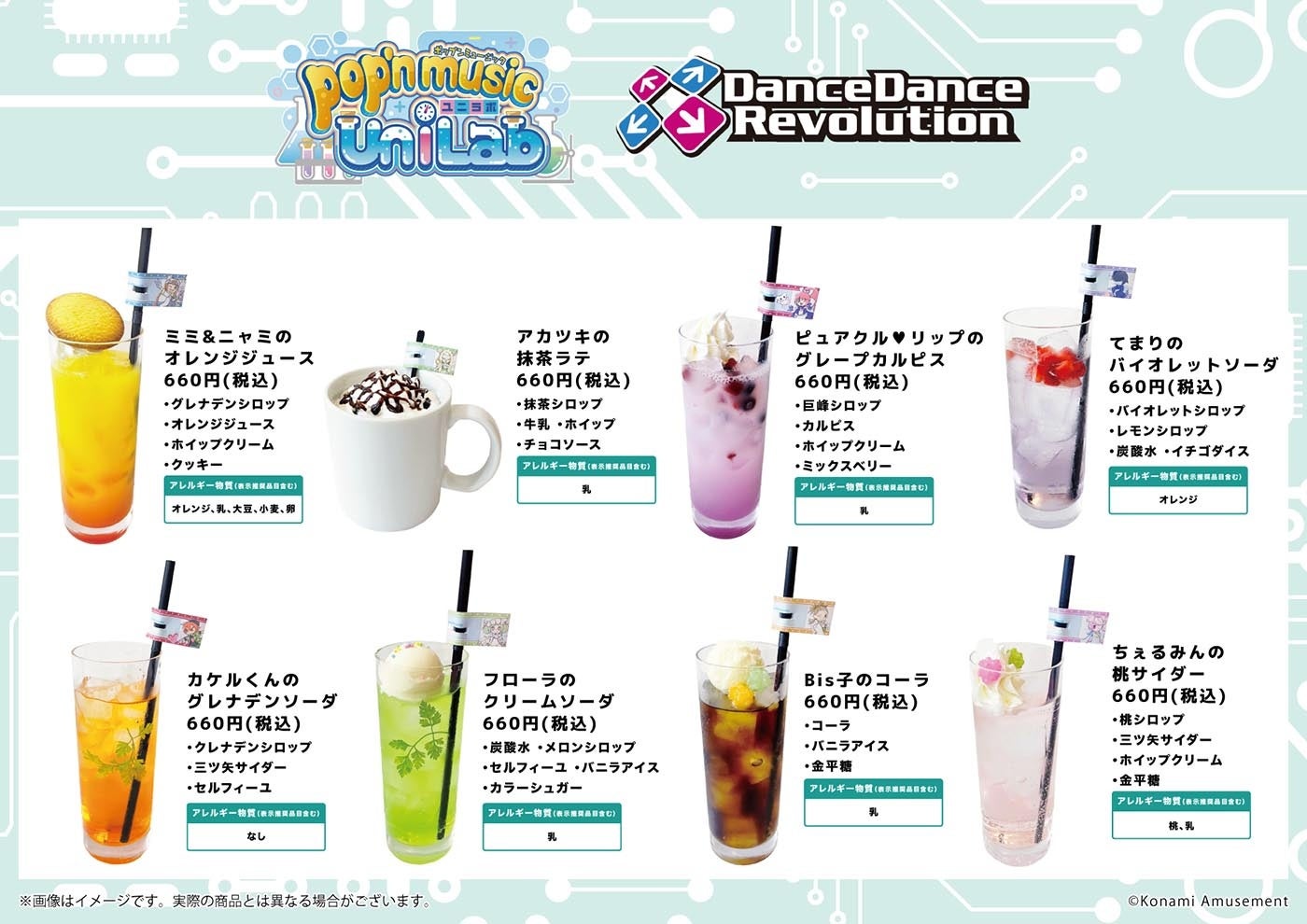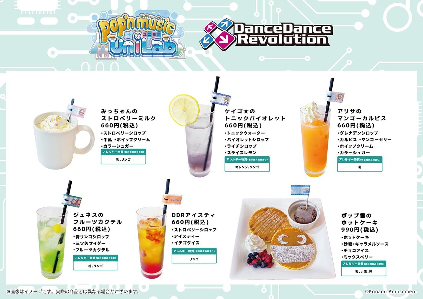 コラボメニューは、『pop’n music』『DanceDanceRevolution』の作品やキャラクターにちなんだものばかり。