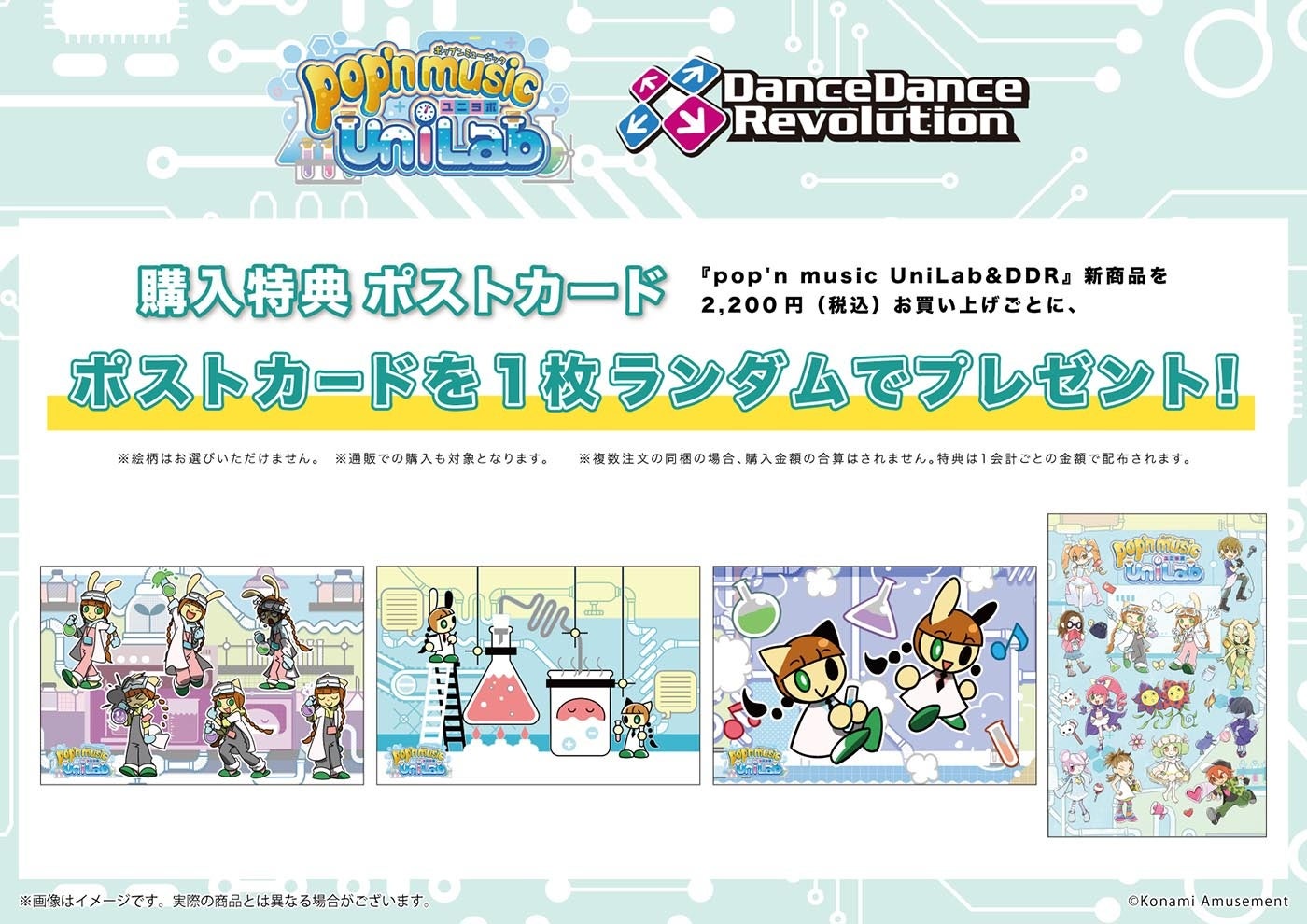 コラボカフェにあわせて登場した『pop’n music』と『DanceDanceRevolution』の新作グッズを、2,200円(税込)お買い上げごとにポストカード(全4種)をランダムで1枚プレゼントします!