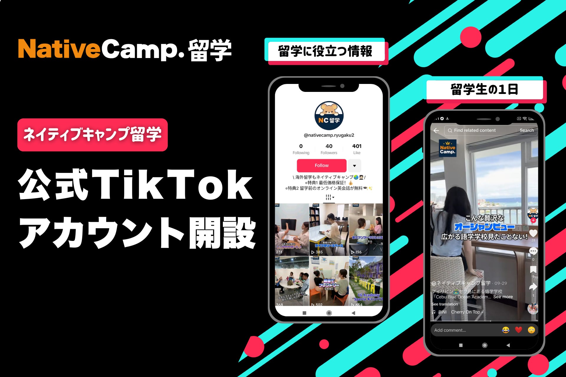このたび、「ネイティブキャンプ留学」は、公式TikTokアカウントを開設いたしました。留学に関する最新かつ正確な情報を分かりやすくお届けすることを目的に、日々さまざまな動画を配信しています。
