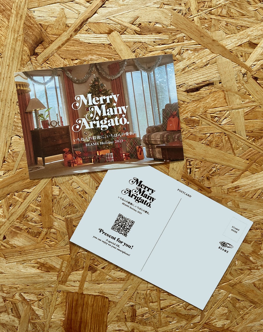 「BEAMS公式オンラインショップ」でお買い上げ頂いた方には、今年の『BEAMS HOLIDAY 2023』の象徴となるクリスマスツリーを施したグリーティングカードをプレゼントします。背面には、AR機能でファッションを楽しめるDRESS XへアクセスできるQRコード付きです。リアルなバーチャルファッションをお楽しみください。