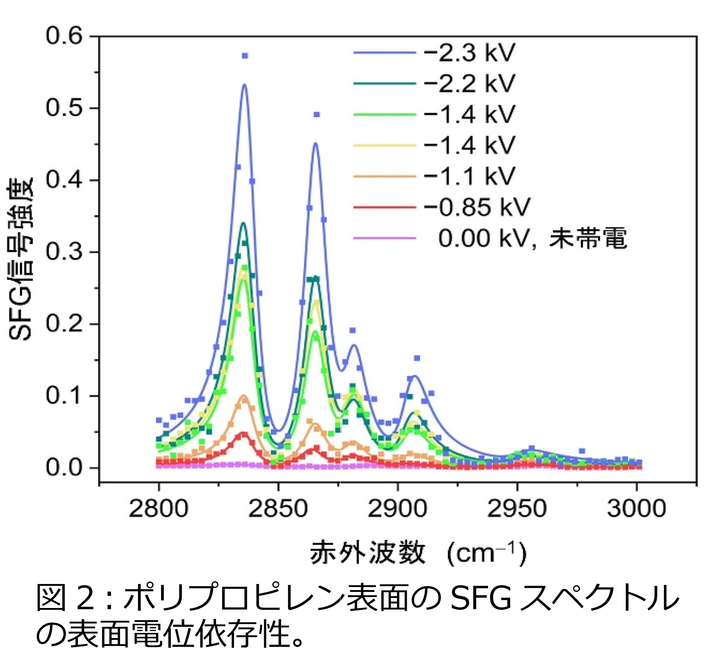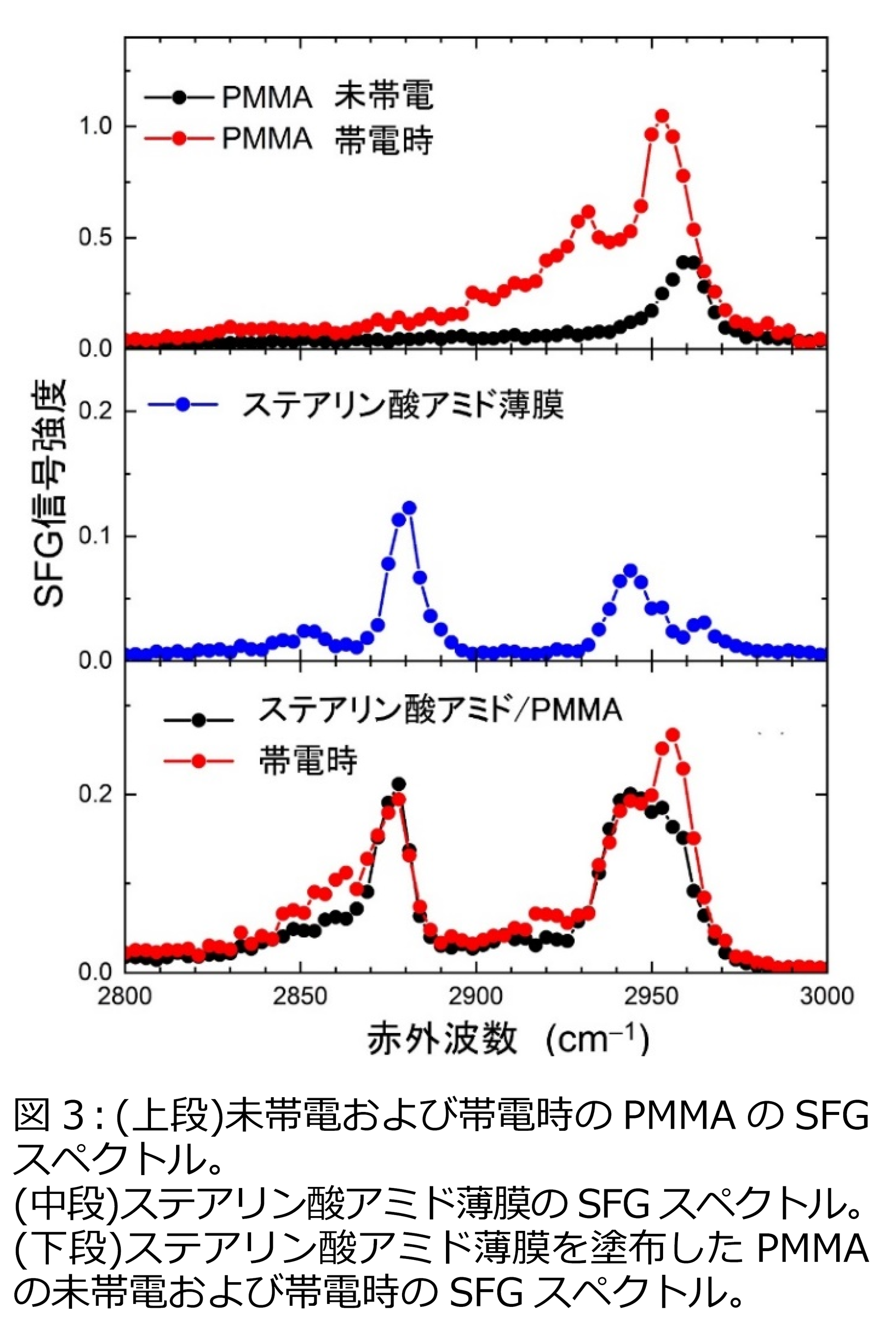 さらに、ポリメチルメタクリレート(PMMA・アクリル樹脂)の上に、有機薄膜としてステアリン酸アミドを薄く塗布した試料を用いて帯電によるSFGスペクトルを調べてみると、帯電することによって、有機薄膜で覆われている内側のPMMAに由来するSFGの信号強度が増加していることが認められました(図3)。これは、試料の帯電によって表面に存在する電荷に由来する電界が、有機薄膜に留まらず、下地となっているPMMA試料の内部にまで広がっていることを示しています。