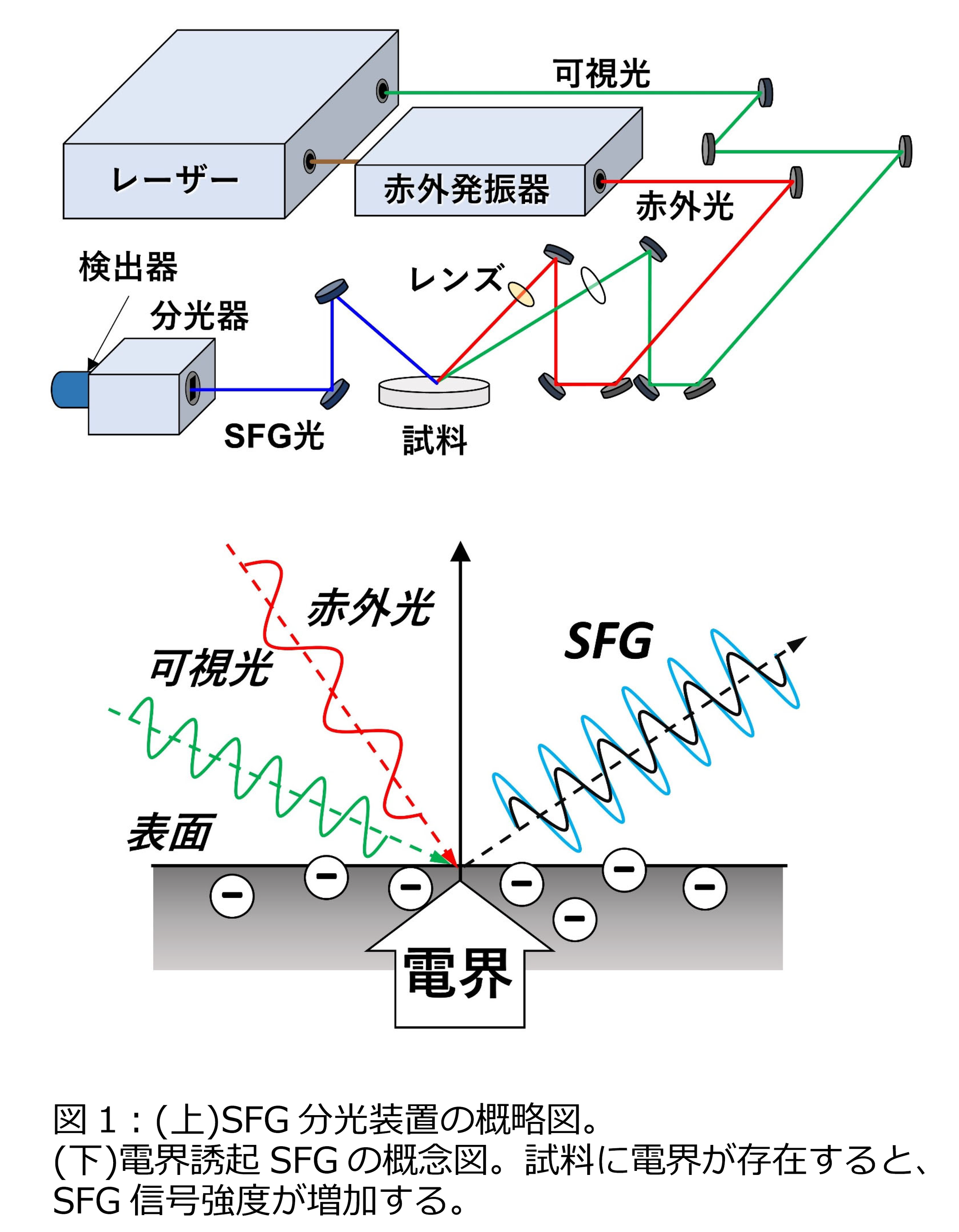研究グループでは、これまで材料表面や界面の分子の情報を選択的に計測・評価する手法として、和周波発生分光法(SFG分光法)を用いた有機物界面の評価・解析技術の研究を進めてきました(図1)。SFG分光法は高強度のパルスレーザー光を使った分光法の一種で、赤外光と可視光を同時に照射することで発生するSFG光を検出します(図1上)。さらにSFG分光法は、表面や固体内部の界面の分子の向きや反応などを詳しく調べることが出来ます。このSFG分光法では、試料に電界が存在する時には、その電界の強さに応じて得られるSFGの信号強度が増加する「電界誘起効果」と呼ばれる効果があることが知られています(図1下)。研究チームはこれまでに、この電界誘起効果を用いることで、有機ELや有機トランジスタなどの有機デバイスを駆動したときに、内部に存在する電荷の情報を高感度で選択的に調べることが可能になる計測技術を開発してきました。