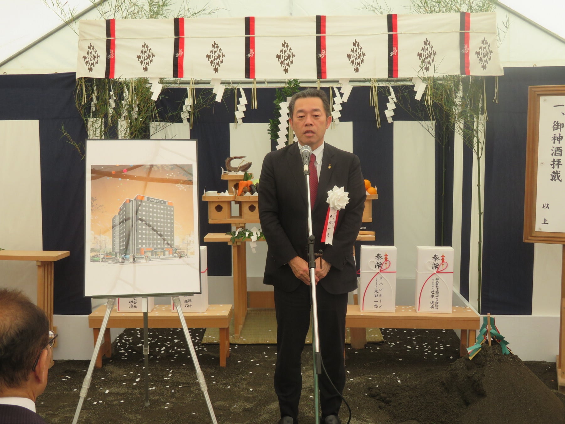 神事後の挨拶において、アパグループ社長 兼 最高経営責任者(CEO)の元谷 一志は、「本日、アパホテル〈門前仲町駅前南〉の起工式を開催することができ嬉しく思う。この町はかつては門前町として栄えた場所であり、交通アクセスの優れている「門前仲町駅」の近くにこの度ホテルを建てることになった。観光客や訪日外国人など、このエリアに多くの人が集まり、皆が交流できる施設として、多くの人に永く愛されるホテルとしていきたい。また、工事にあたっては無事故無災害に十分に注意し、開業に向けて頑張って欲しい。」と述べた。