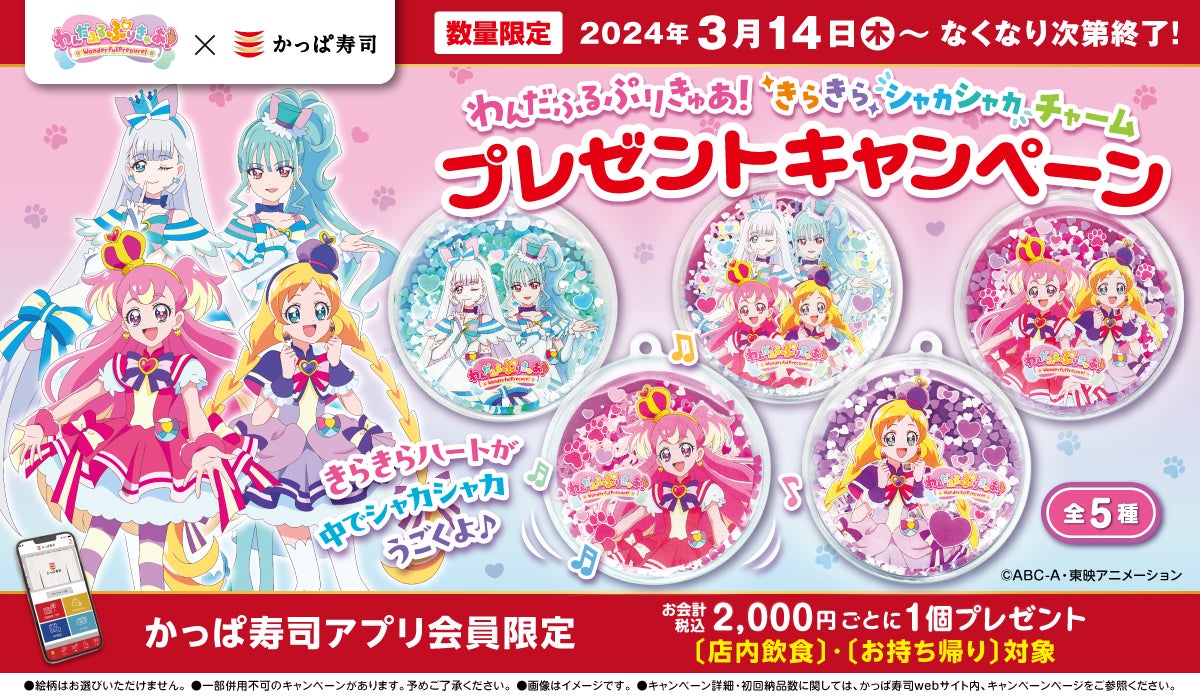・内容:期間中、2,000円(税込)以上ご利用いただき、レジにてかっぱ寿司公式アプリ内の「バーコード付引換券」をご提示いただいたお客様に、『わんだふるぷりきゅあ!』×かっぱ寿司の「きらきらシャカシャカチャーム(全5種)」を 2,000円(税込)ごとに1個プレゼントいたします。