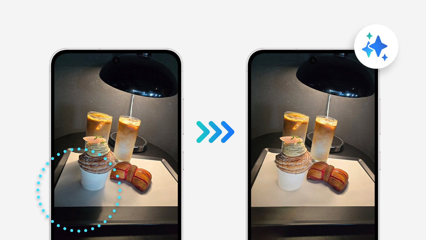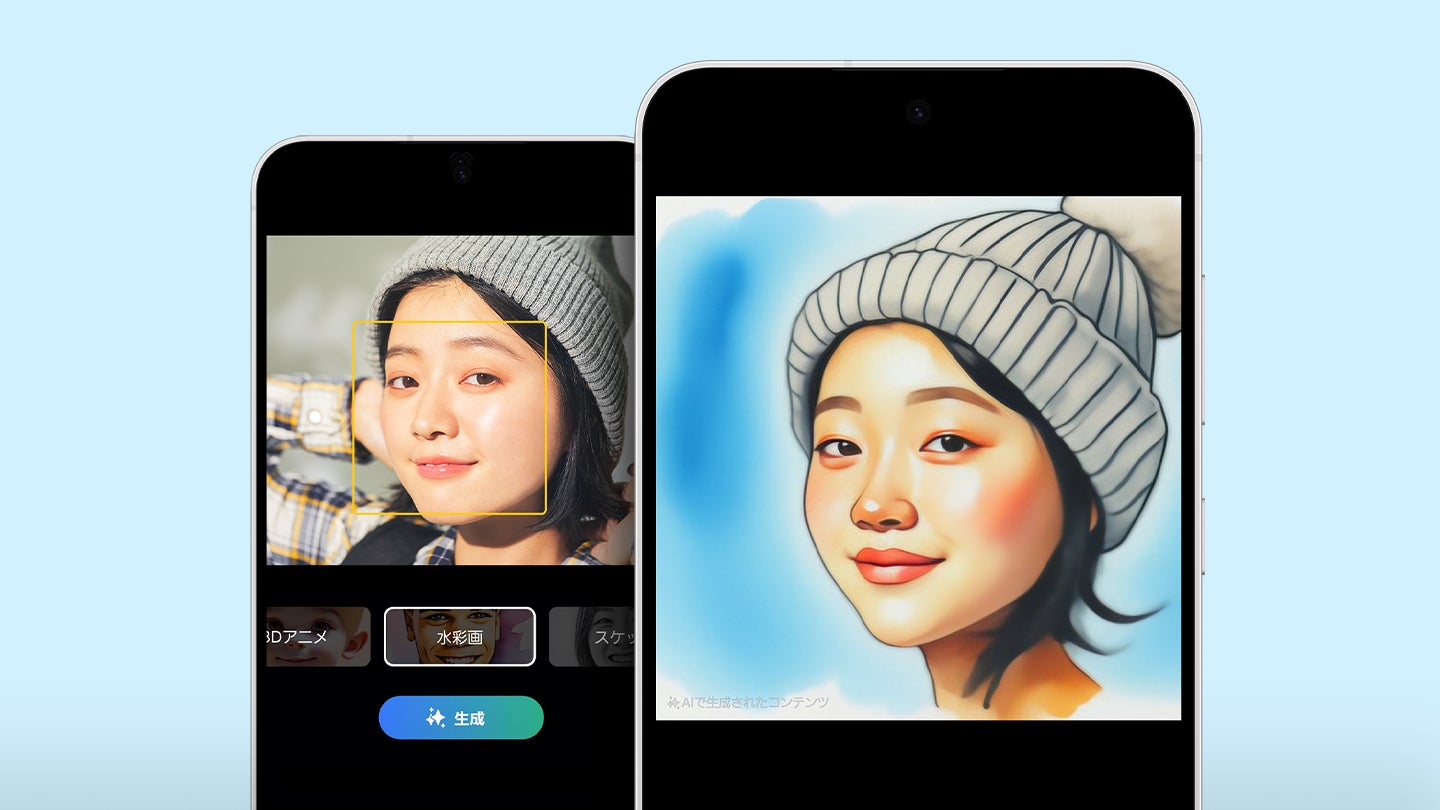 ※1 生成AI編集機能を使用するには、ネットワーク接続とSamsungアカウントへのログインが必要です。生成AI編集で編集すると、写真は最大約1,200万画素にリサイズされます。AIによって生成された画像であることを示すため、保存時画像に透かしが重ねられます。生成された出力画像の正確性と信頼性は保証いたしません。