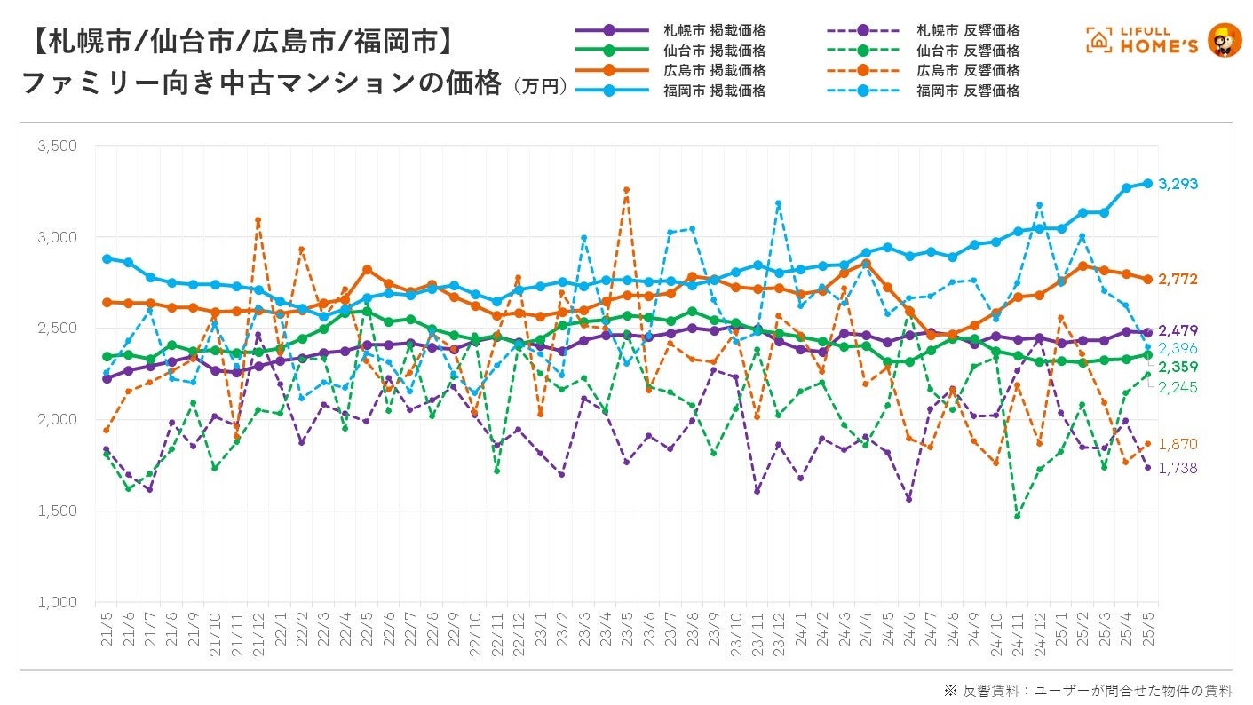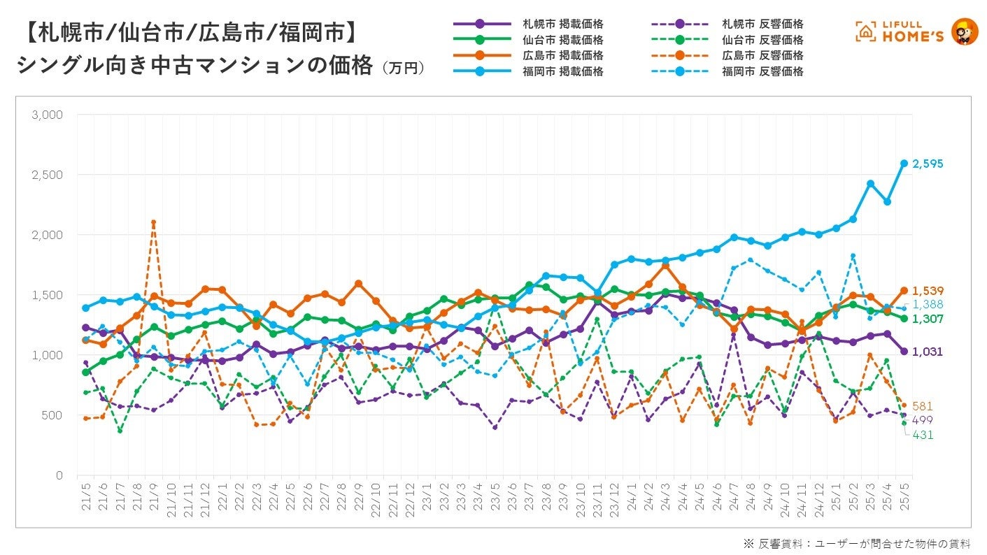 また、地方4市(札幌市、仙台市、広島市、福岡市)では、福岡市が前年同月比140.2%(1,850万円→2,595万円)、前月比でも113.9%(2,279万円→2,595万円)と急激な上昇が見られます。