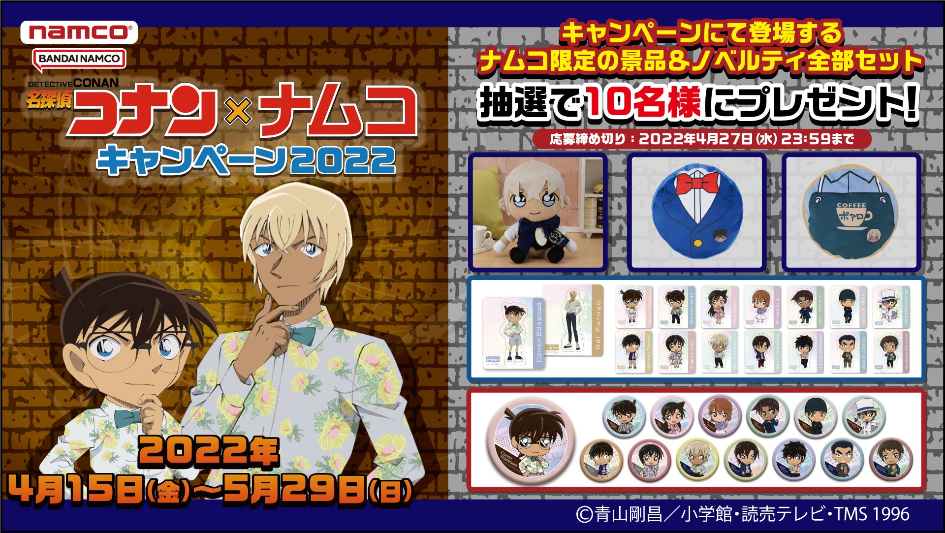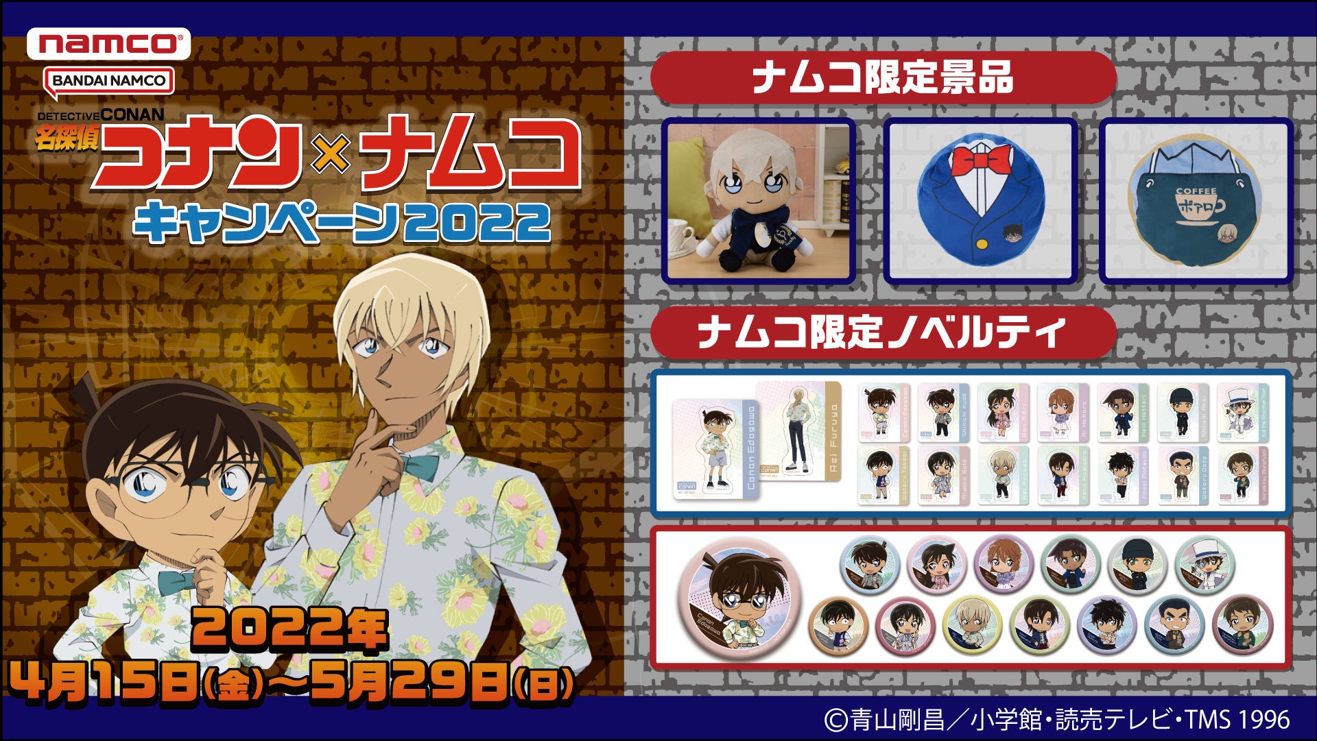 株式会社バンダイナムコアミューズメントは「名探偵コナン×ナムコキャンペーン2022」を、2022年4月15日(金)から5月29日(日)まで、全国約210店舗「namco」直営アミューズメント施設で開催します。