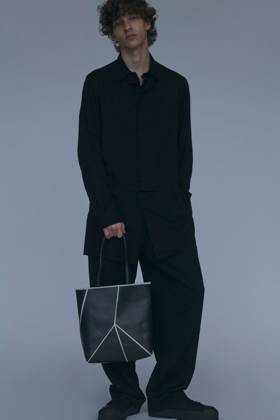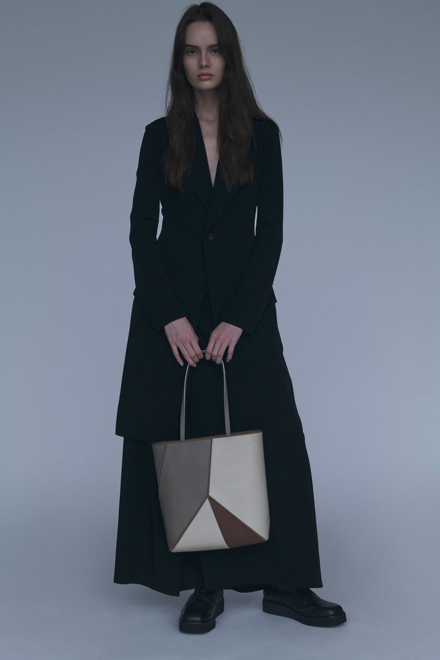 折り紙のようにたためる造形が特徴的な「Cubism」は、2024-2025秋冬のテーマとも呼応しながら、過去に発表された「立体」に対する異なるアプローチを持つシルエット。キュビズムの絵画のように立体物が分解され平面上に再構成がされたような幾何学形体の線は、折りたたむ際の折りすじになり、造形に小君良く強弱を加えています。平面的なクラッチバッグが、トートバッグになるユニークなフォルム。