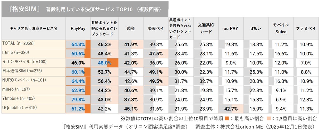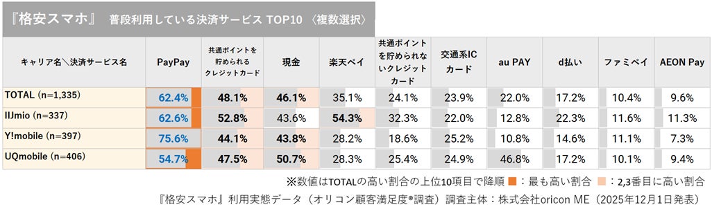 そのほか「共通ポイントを貯められるクレジットカード」「現金」が全体の上位を占めるなか、「IIJmio」「日本通信SIM」「NUROモバイル」では「楽天ペイ」が上位に挙がりました。また、「UQmobile」では「au PAY」が上位に挙がりました。