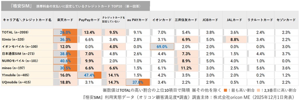 一方で、「イオンモバイル」では親会社が発行する「イオンカード」が69.0%で最多、「Y!mobile」では“PayPay経済圏”と親和性の高い「PayPayカード」が47.4%で最多、「UQmobile」ではKDDIグループの「au PAYカード」が37.8%で最多となり、自社(または親会社)系カードが利用されている割合が高い傾向となりました。