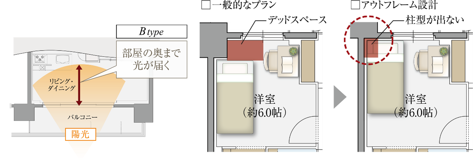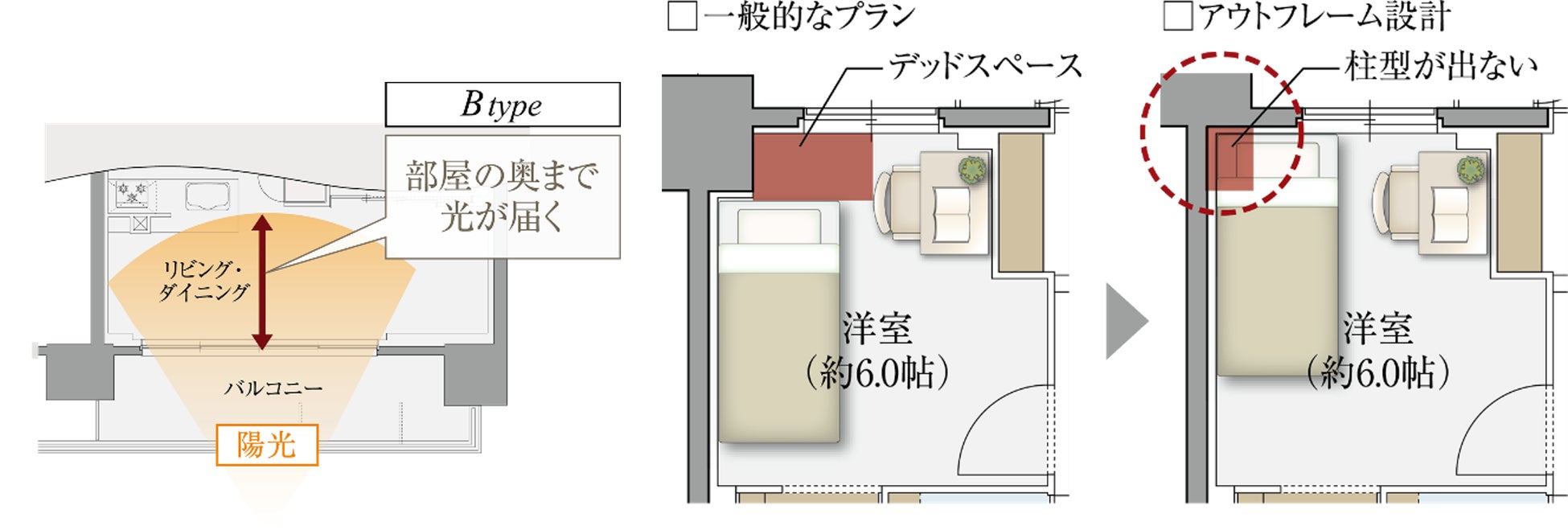 また、共用廊下側・バルコニー側の柱を外部側に出した両面アウトフレーム設計を採用し、より広くゆとりある室内空間を実現。家具を配置しやすく、スペースを有効に活用できます。収納にはウォークインクロゼットやシューズインクロゼットを採用するなど、物を整理整頓しやすい快適な住環境を目指したプランニングも特長となっています。