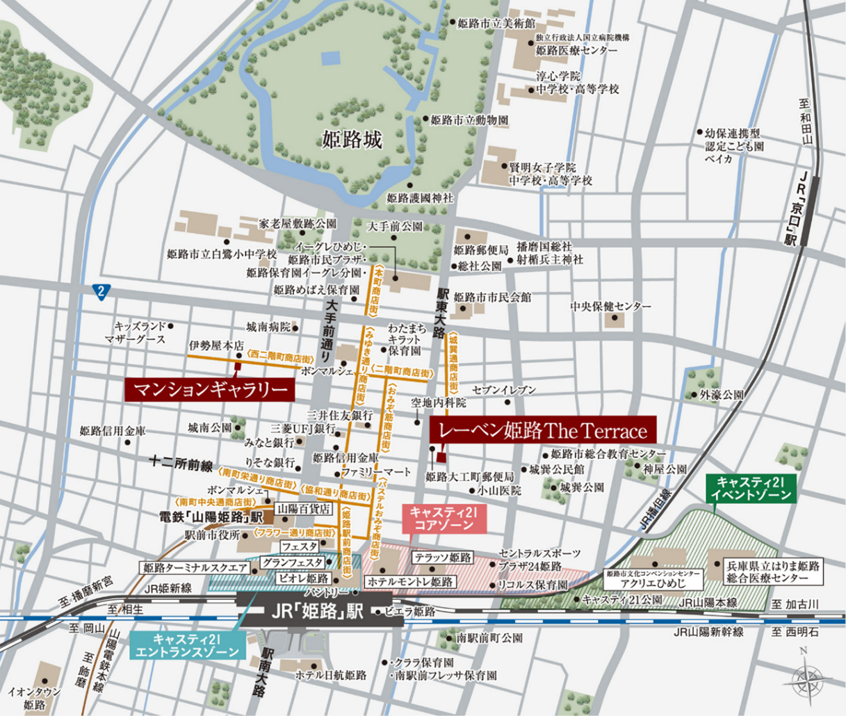 JR「姫路」駅直結の商業施設「ピオレ姫路(徒歩7分)」や映画館併設の「テラッソ姫路(徒歩4分)」をはじめ、「兵庫県立はりま姫路総合医療センター(徒歩12分)」などを続々と誕生させ、駅前を一新させた大規模再整備“キャスティ21計画”に近接。さらに、駅と姫路城をつなぐ“みゆき通り商店街”をはじめ、“二階町商店街”や“おみぞ筋商店街”など、活気あふれる商店街が徒歩7分圏内に集結しています。駅近の利便性を享受しながら、姫路城の南東方向(巽)に位置する“城巽地区”のセンターポジションが暮らしの舞台となります。