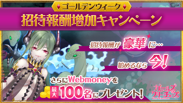 CTW株式会社は、「ガールズ&クリーチャーズ」の招待報酬強化キャンペーンおよび公式Twitterにてwebmoneyキャンペーンを開催したことをお知らせいたします。