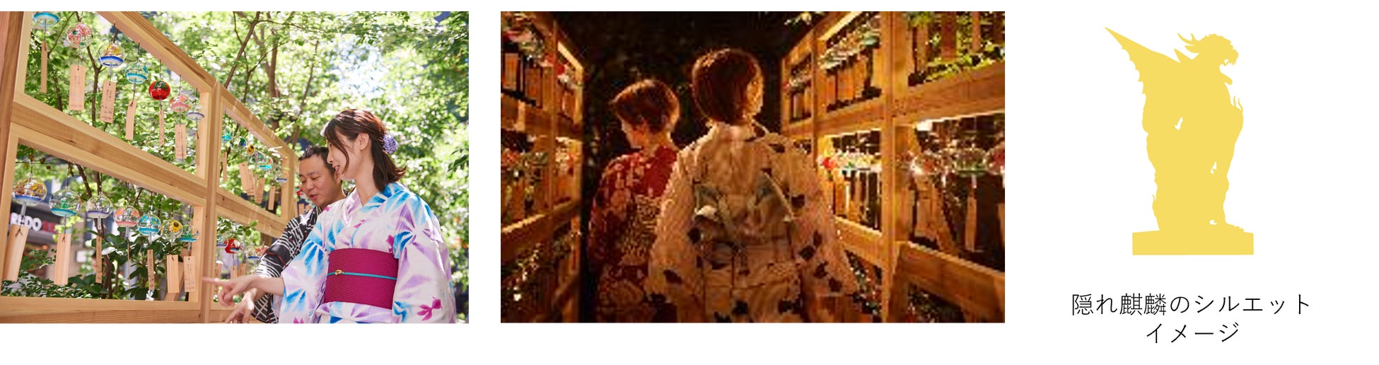 今年は福徳神社横通路の「森の風鈴小径」とCOREDO室町テラス けやき広場の2か所で江戸風鈴のスポットが登場します。福徳神社から福徳の森へと続く小径では、両側を約200個の江戸風鈴で装飾し、夜にはライトアップも実施。また、名橋・日本橋の装飾のモチーフにもなっている麒麟が合計2体隠れており、風鈴を楽しみながら“隠れ麒麟探し”もお楽しみいただけます。