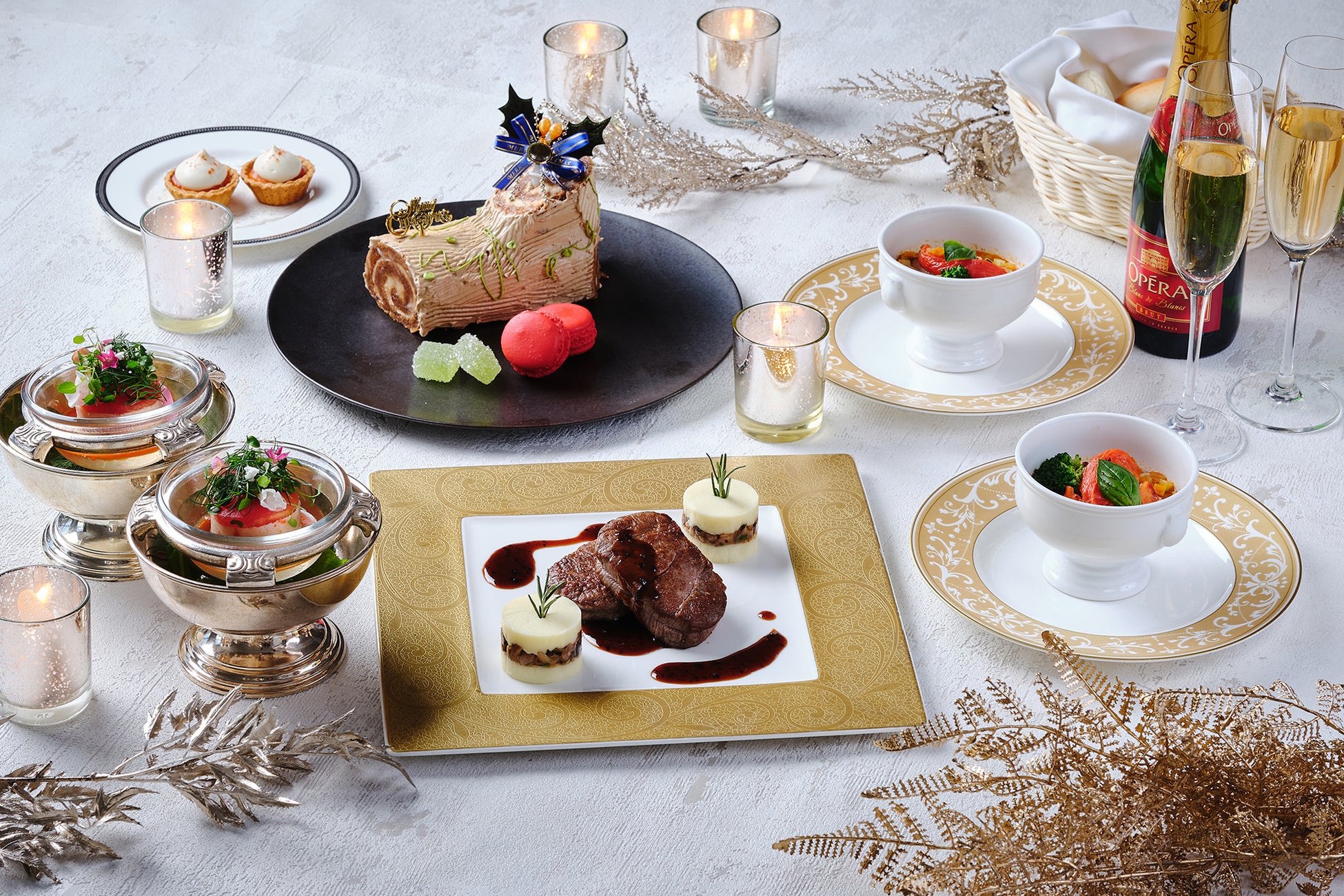 煌く夜景を眺めながらお部屋で二人きりのディナータイムをお楽しみいただけるよう、インルームダイニングのスペシャルディナーコース、スパークリングワインとクリスマスケーキをお部屋までお届けいたします。