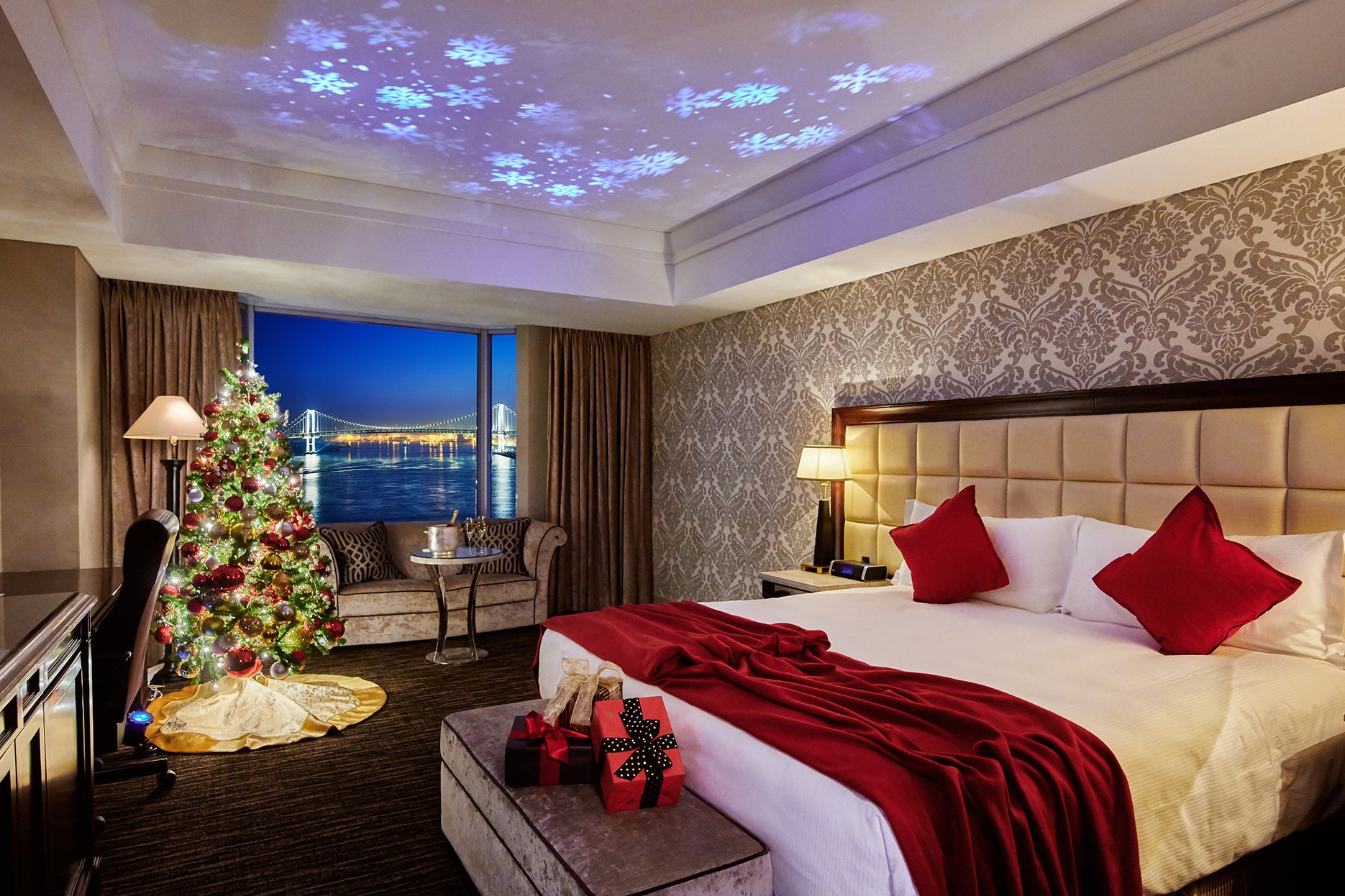 一年で最も煌びやかに輝くクリスマスシーズンに向けて、大切な人と過ごす特別な夜に華を添えるプロモーションを期間限定で実施いたします。ロマンティックな雰囲気が漂う18階の「クリスマスフロア」は、足を踏み入れた瞬間、クリスマスのデコレーションが施された華やかな世界が広がり、心躍るクリスマスの特別感をご体験いただけます。お部屋には、クリスマスツリーと雪の結晶のプロジェクターライトでクリスマスムードあふれる空間を演出。さらに、高層階のリバービューのツインルームには、天井に映し出される雪の結晶が幻想的な雰囲気を作り出し、フェスティブ気分になれる「スノーホワイトルーム」をご用意いたしました。
