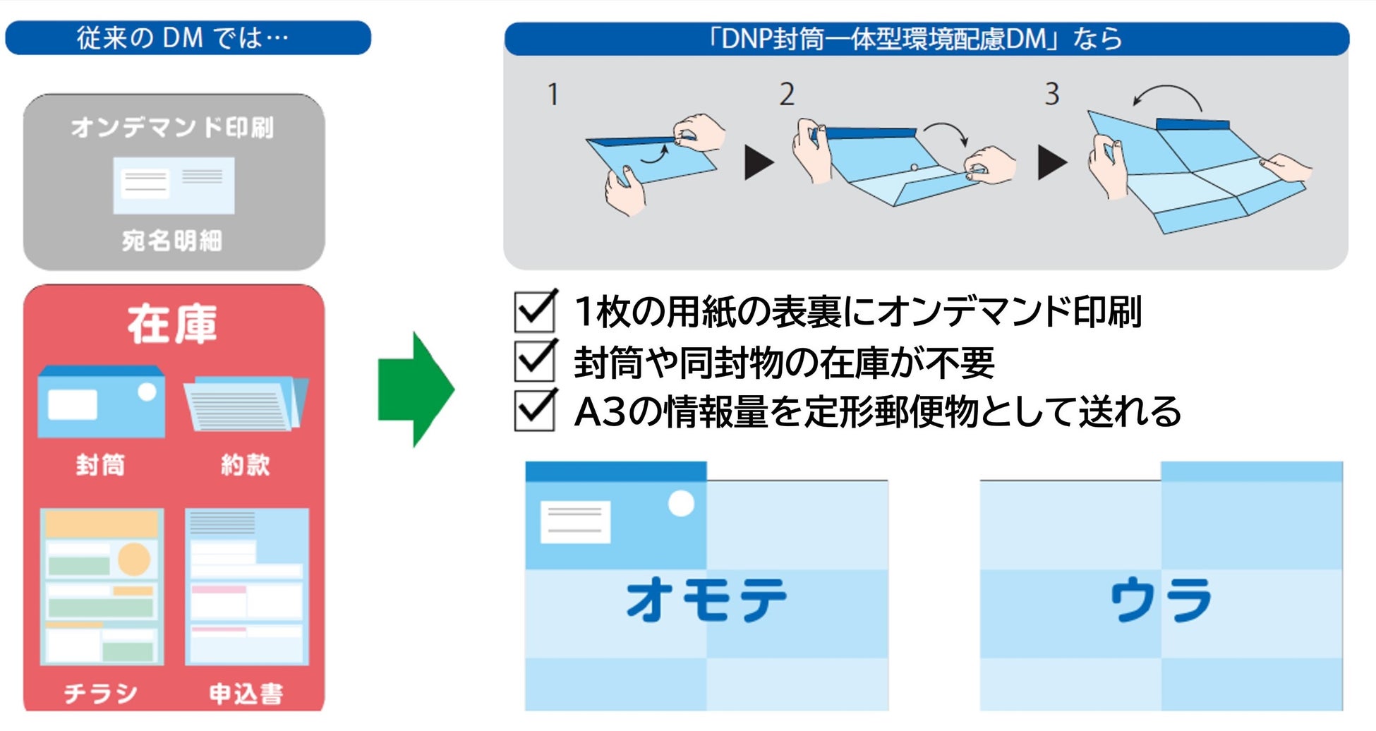 こうしたニーズや課題に対してDNPは今回、環境負荷の低減と郵送コストの削減を両立する新しい形の封筒一体型DM「DNP封筒一体型環境配慮DM」を開発し、提供を開始します。