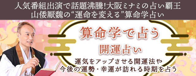 大阪ミナミの占い覇王として数々の番組やメディアで人気を博している山倭厭魏(やまとおうぎ)による本格算命学サイト『山倭厭魏の算命学』にて、この度『開運占い』を無料公開いたしました。生年月日を入力するだけで、あなたの運気をアップさせる開運法や今後の運勢、幸運が訪れる時期を占うことができます。