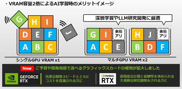 グラフィックスメモリ(VRAM)を48GBも搭載する最新プロフェッショナルGPU「NVIDIA RTX™ 6000 Ada 世代」をはじめ、予算や研究開発規模に合わせてお選びいただける「NVIDIA® GeForce RTX™ グラフィックスカード」と「NVIDIA® RTX™ プロフェッショナルグラフィックスカード」をご用意。 1台のPCに2枚搭載し、合計で最大96GBという超特大容量のVRAMを用いることで、メモリ不足に陥りやすい深層学習やLLMの学習・解析などに余裕をもって処理することができます。