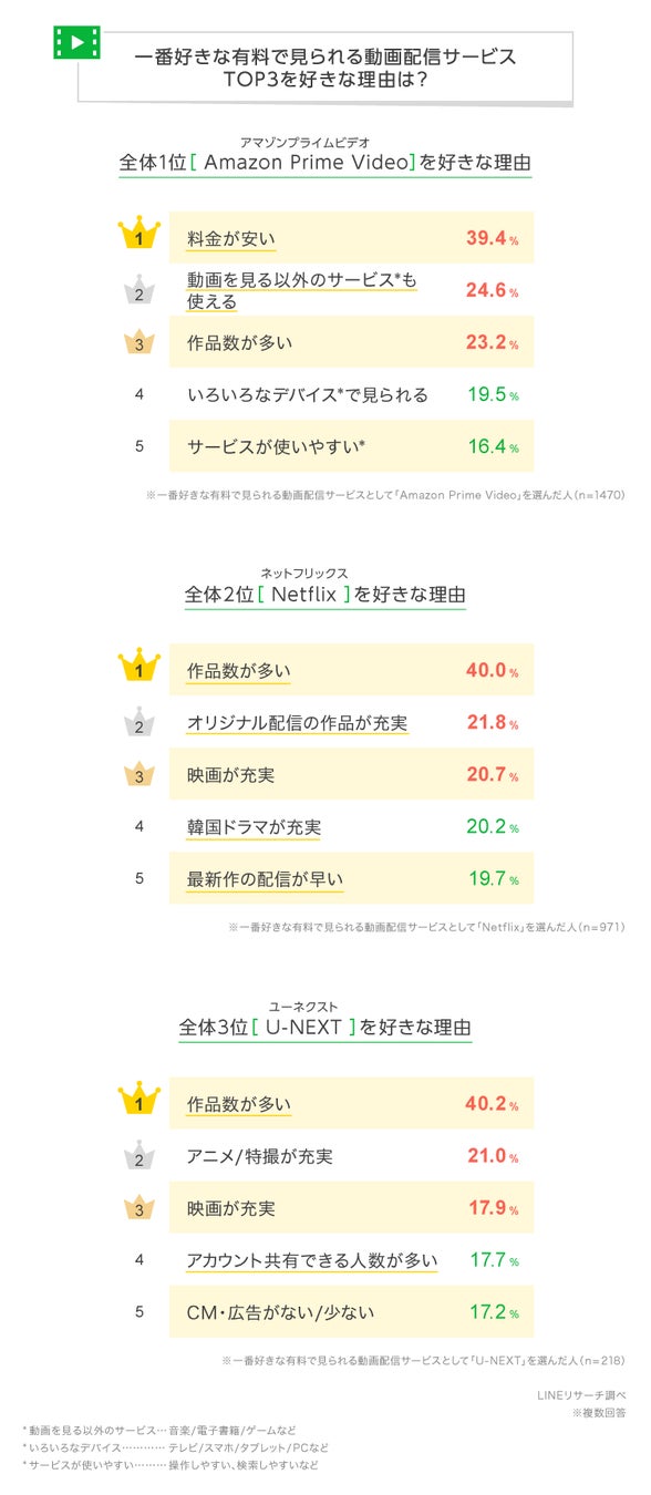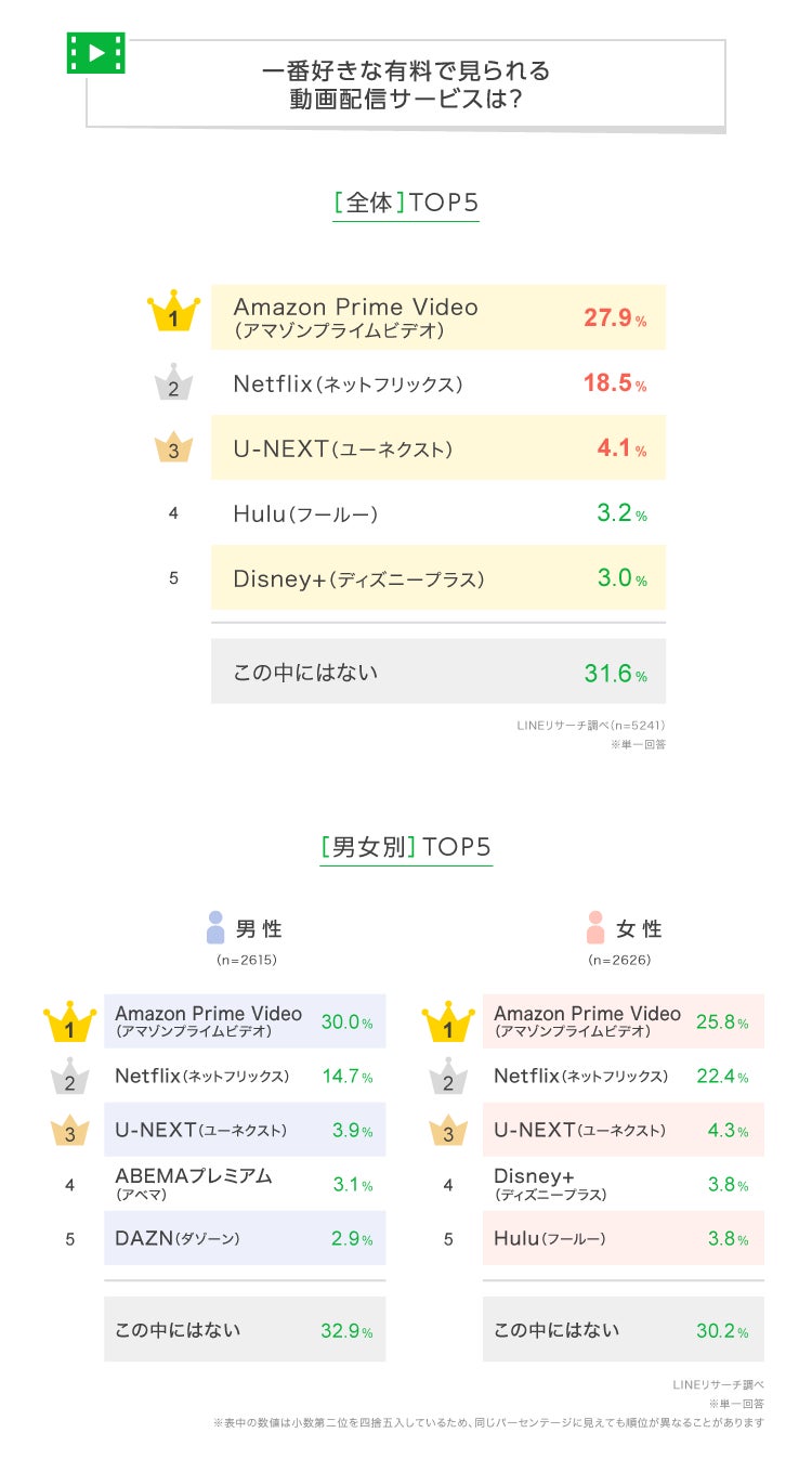 【LINEリサーチ】一番好きな有料で見られる動画配信サービス、TOP2は「Amazon Prime Video」「Netflix」