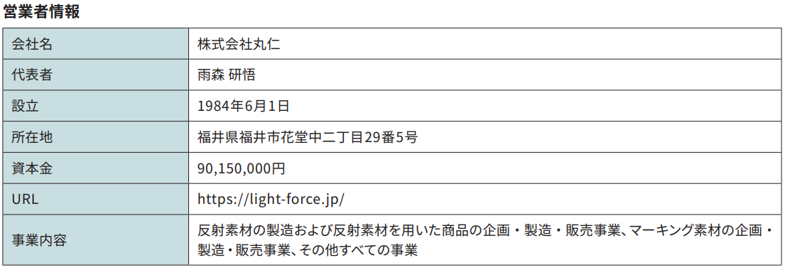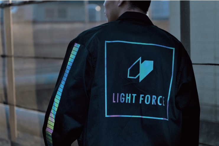 古くから繊維産業が盛んな福井県福井市にて1984年に創業した株式会社丸仁。同社は、スポーツユニフォームに企業ロゴなどを貼り付ける際に用いられる、熱転写プリントマークの製造で事業を拡大してきました。その技術を活かし開発された、反射する光がオーロラのようにグラデーションする再帰性反射材「オーロラリフレクター®」は、日本国内外で特許を取得している同社の看板素材です。「オーロラリフレクター®」を含むファッション性に特化した反射材シリーズを『LIGHT FORCE』と名付け、これまで多くのアパレルブランドと協業を成功させてきました。最近では北陸新幹線の福井・敦賀開業PRにも採用され、その可能性はファッション分野にとどまりません。