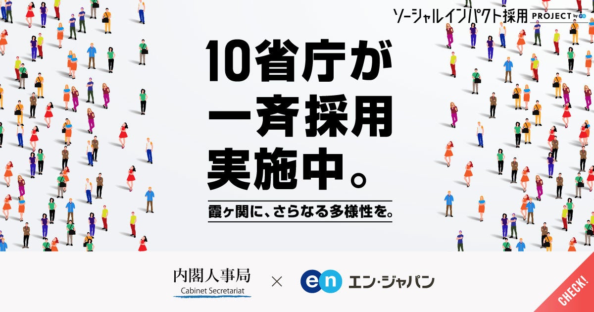 内閣官房 内閣人事局が広報を行なう「国家公務員 経験者採用試験」。民間出身者を採用すべく各省庁が同時に行なう中途採用試験です。今回、同試験による中央10省庁の採用をエン・ジャパンが全面的に支援することが決定。国の政策の企画立案や法令案の作成に携わる「係長級:事務」を一斉に募集します。