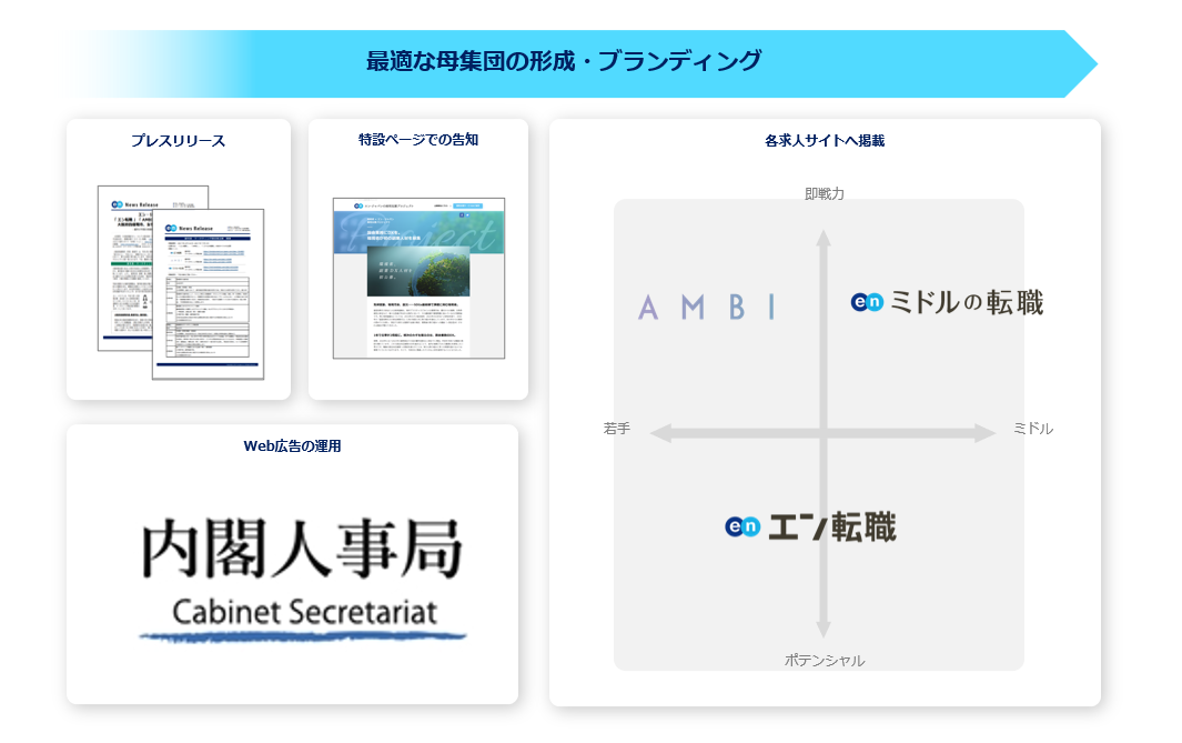 プレスリリースや特設ページ、Web広告での告知に加え、各求人サイトでの集客支援を行ないます。『エン転職』『AMBI』『ミドルの転職』とターゲットの異なる3つの求人サイトを活用することで、ターゲットへ網羅的に求人を届けます。