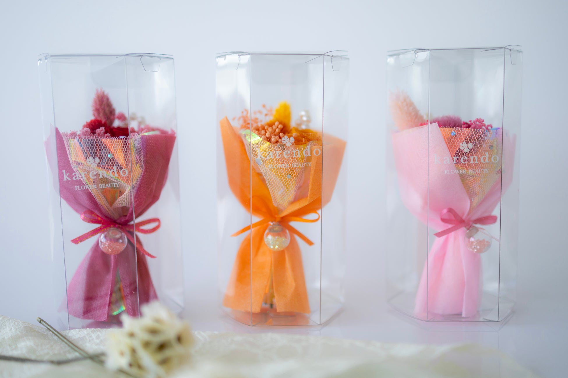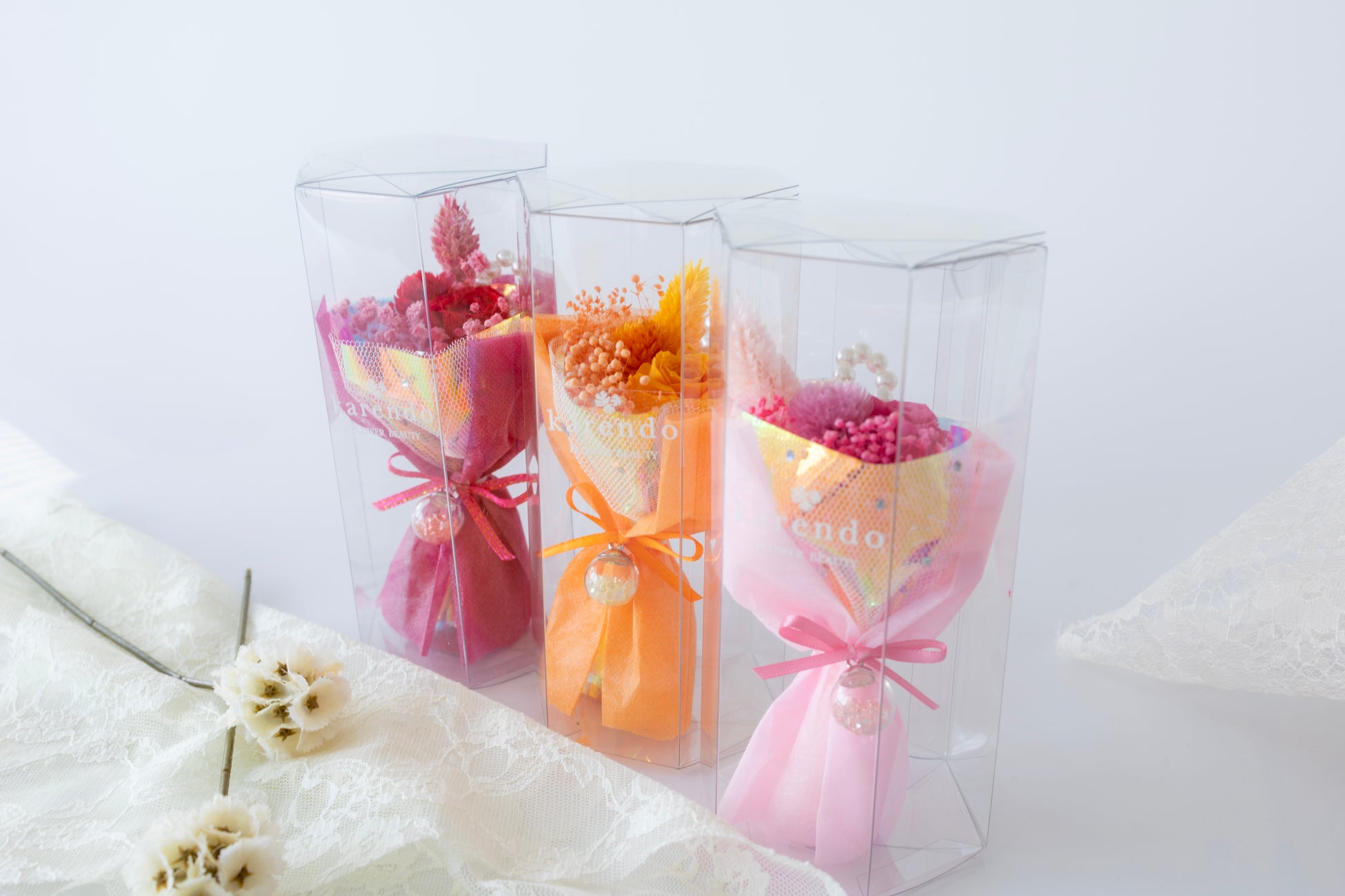 「プティメゾン」は、生花のようなみずみずしい質感と美しい色合いを3年以上変わらず楽しめるプリザーブドフラワーのブーケで、リボンの下には可愛らしいチャームがついています。カラーは、レッド・オレンジ・ピンクの3色をご用意しております(※色はお選びいただけません)。生花と違い水やりの必要がないため、手入れが簡単な点も贈り物に適しています。