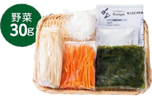 「もっとビオサポ!切昆布のぽん酢和え」は良質な食物繊維が豊富な、昆布やきのこ、その他野菜や春雨から、1人前で1日に摂りたい食物繊維量の1/3である6g以上(※1)が摂取できます。食材セットの昆布を茹でたら、同じくセットの春雨と野菜(えのき、にんじん)、添付調味料(おろしぽん酢だれ)と合わせるだけ。家庭で用意する食材や調味料はありません。「ビオサポ食材セット」の中では最短の、調理時間約5分で簡単に副菜が1品出来上がります。ぽん酢の酸味が爽やかな、さっぱりと食べられる和え物です。 「もっとビオサポ!」シリーズの中でも、 第1弾の腸内環境応援をテーマにした「もっとビオサポ!ポークビーンズ」がデビュー以来好評のため、腸活第2弾として副菜のミールキットが誕生しました。