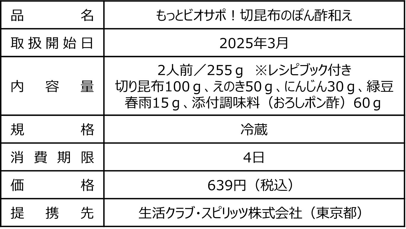 生活クラブ事業連合生活協同組合連合会(本部:東京都新宿区、会長 村上彰一、以下生活クラブ)は、健康を切り口としたミールキット「もっとビオサポ!食材セット」の新メニュー「もっとビオサポ!切昆布のぽん酢和え」の取り扱いを2025年3月17日から開始します。