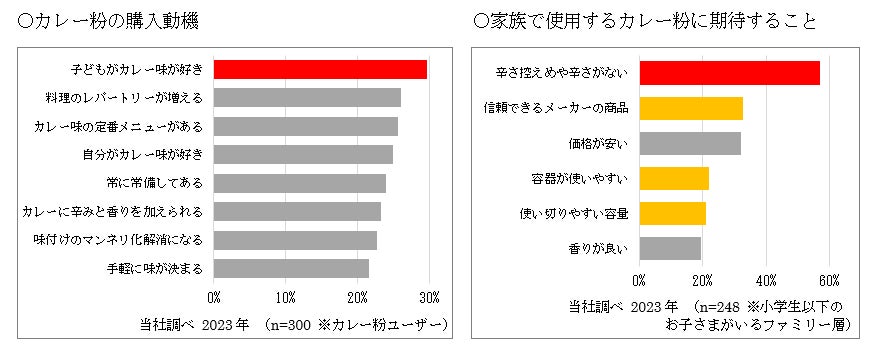 カレー粉の購入動機として、「子どもがカレー味が好き」との理由を挙げる方が多く、お子さまに食事 を楽しんでもらう工夫として、カレー粉が活用されていることが分かります。一方、子どもを持つファミリー層や熟年層、シニア層においては、カレー粉の「辛み」が購入時のハードルや使用時の不満となっているケースが存在しています。