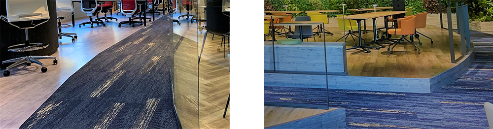 オフィス導線は運河をイメージさせるカラーに。執務スペースを護岸や陸地に見立てた配色の切り替えやスキップフロアを設置し、立体的にも運河のデザインを表現しています。