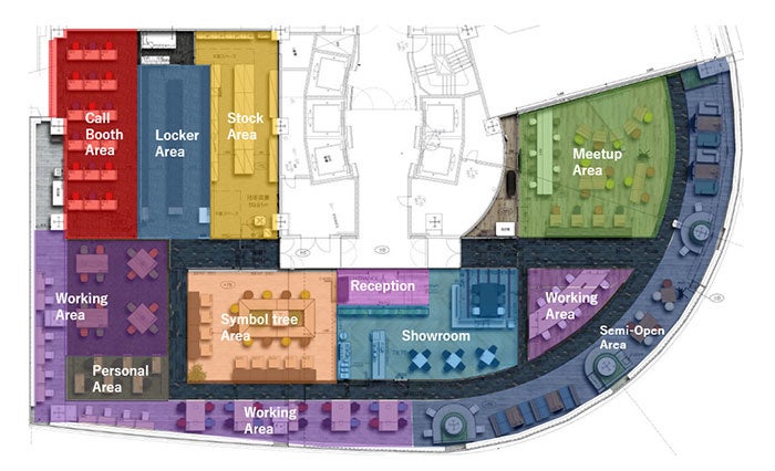 自分のスタイルに応じて時間や場所を選択できる働き方「ABW(Activity Based Working)」を取り入れた完全フリーアドレスで、業務の生産性や効率性を高める機能的な“Office”であるとともに、「この“Office”でかっこよく、働きたい」と思うことができる社員のモチベーションにも寄与する仕様となっています。