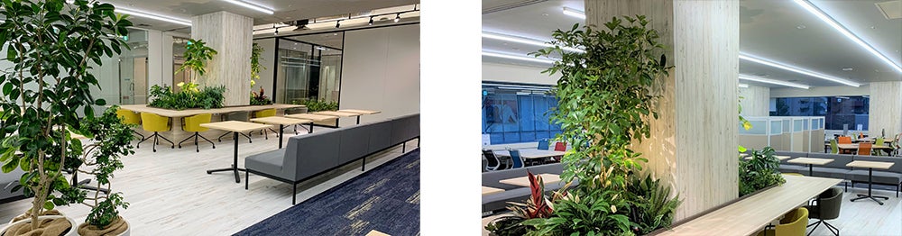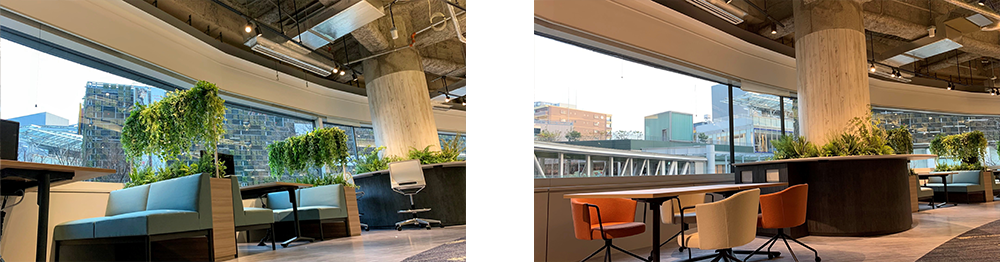 ここで働く社員が心休まる空間で緑に囲まれながら植物の生命力を感じてイキイキと働けるよう、各所にグリーンを設置しました。目にも優しいグリーンカラーは、リフレッシュやリラクゼーション効果も。