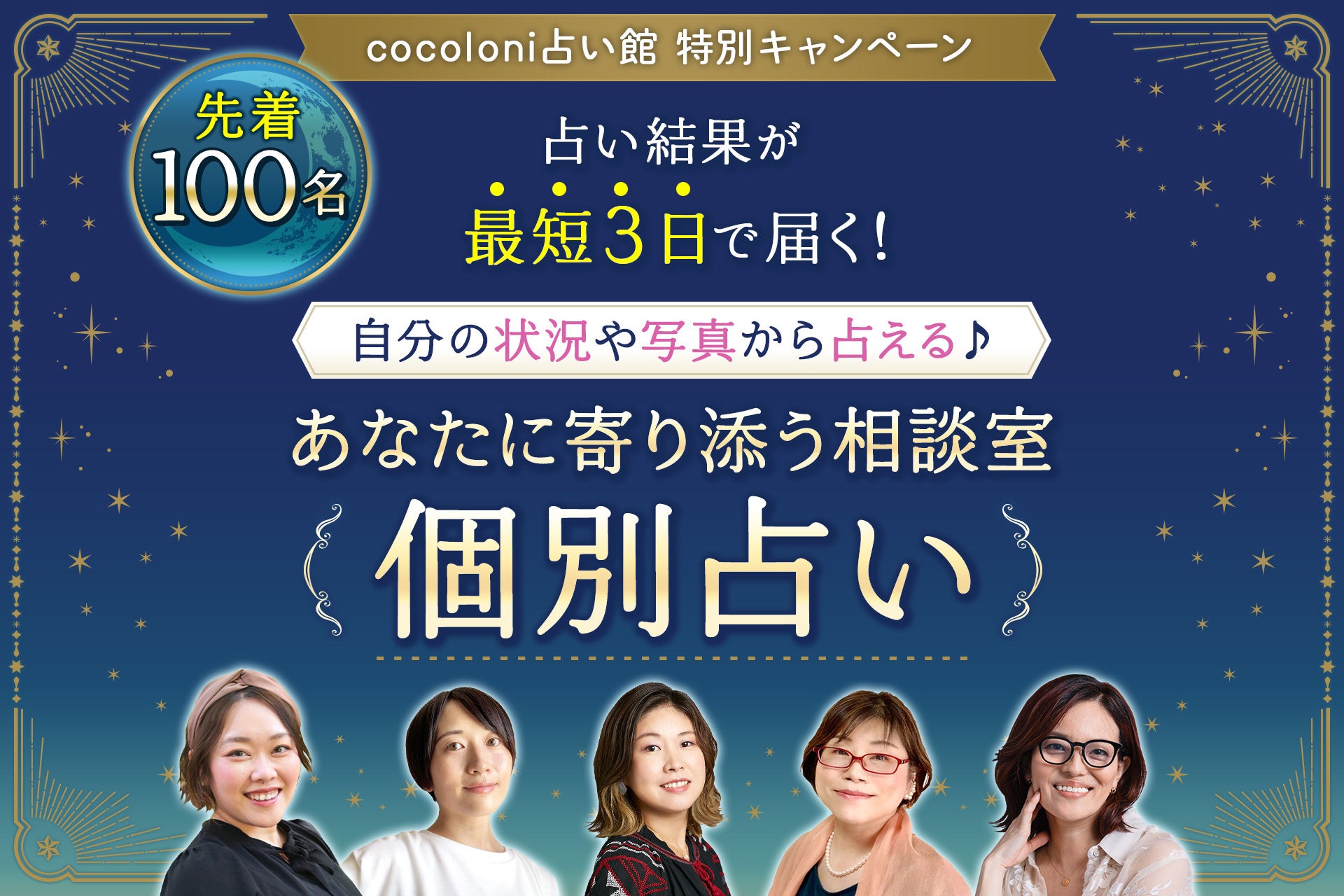 今キャンペーンでは、ご自身のお悩みの状況を伝えたり、写真を送ったりして占う“個別占い”を期間限定でお楽しみいただけます。相談の依頼フォームから、2人の関係などを書き込んで占う「相性占い」、ご自身の状況や悩んでいること、相談したいことを書き込んで占う「お悩み相談占い」、手の写真を送って占う「手相占い」の他に「運勢占い」もご用意いたしました。占いの結果は、3日〜7日後にサイト内マイページの「個別占い」ページからご確認いただけます。占うのは、株式会社cocoloniが提供する占いサービス、チャット占い「Chapli(チャプリ)」電話占い「ロバミミ」リアル店舗「cocoloni占い館(立川店・川越店)」に所属の占い師です。