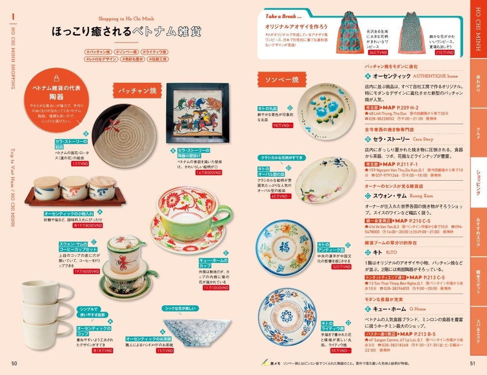 主要都市を旅するモデルプラン、必食グルメ、王道観光、ショッピングなどの目的別の見出しを立てた探しやすい構成を基本に、ベトナムの歴史、必訪スポットをテーマにした雑学や深掘りコラム、地域の様子や旅のノウハウも満載。