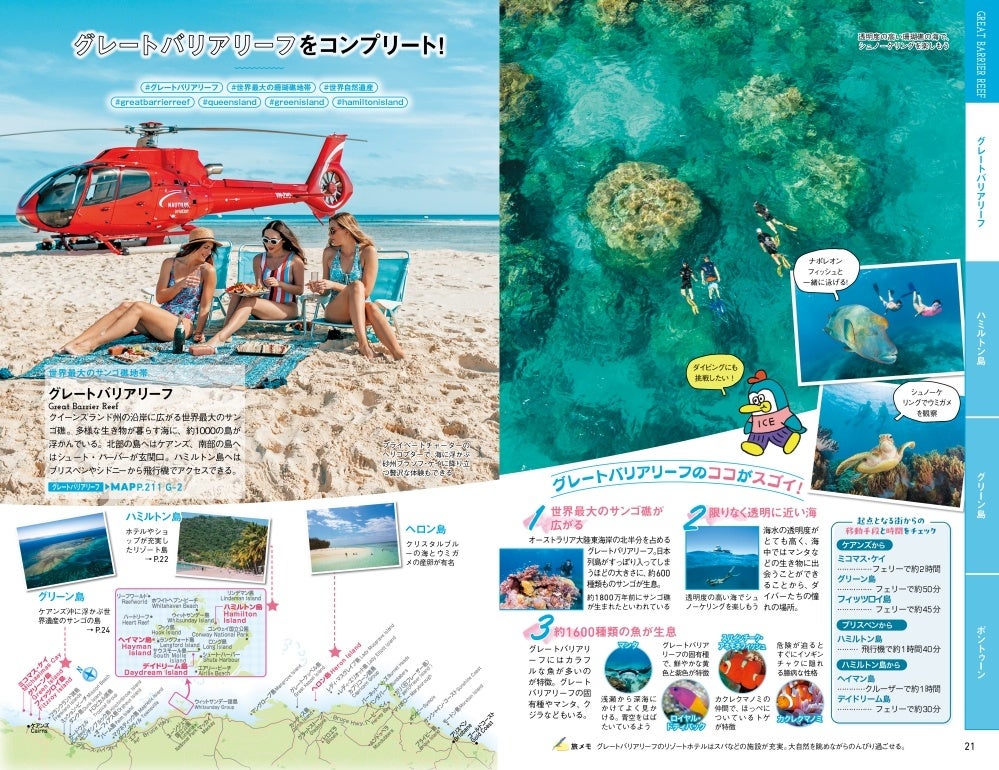 旅のモデルプランや2大王道観光スポットのグレートバリアリーフとウルル-カタ・ジュタをしっかり紹介。シドニー、メルボルン、ゴールドコーストなど、エリアごとに分かれたガイドなので、広いオーストラリアでも使いやすい構成。