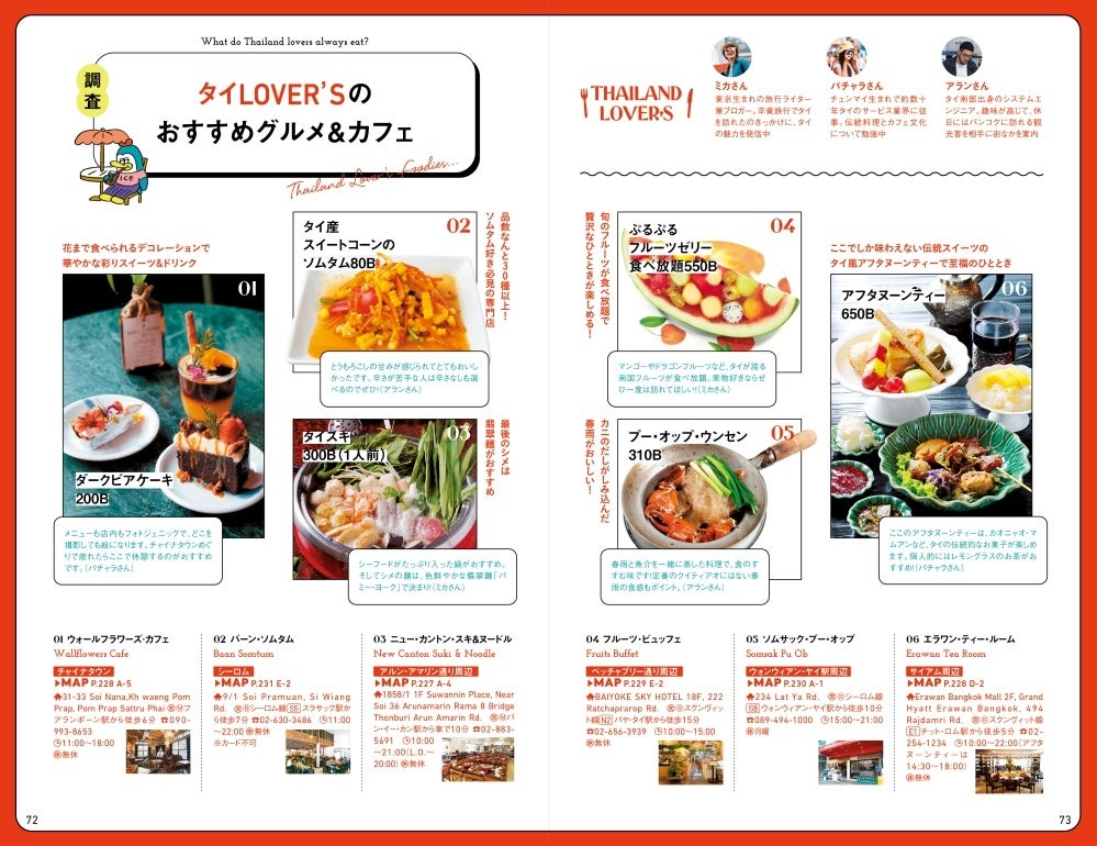 旅のモデルプラン、王道観光、必食グルメ、ショッピング、スパ、街歩きといった探しやすい構成を基本に、タイアートや屋台をテーマにした雑学や深掘りコラム、地域の様子や旅のノウハウももれなく紹介。