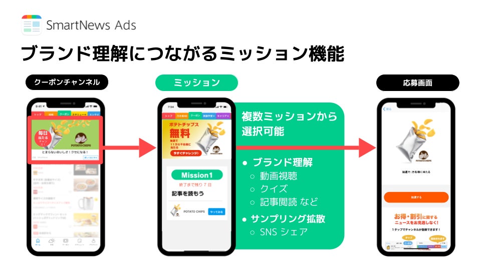 世界中の良質な情報を必要な人に送り届けることをミッションとするスマートニュース株式会社(所在地:東京都渋谷区、代表取締役社長 CEO:浜本階生)は、ニュースアプリ「SmartNews」の新広告プロダクト「SmartNews Sampling Ads」のベータ版を7月1日から提供開始します。本広告プロダクトでは、記事閲読や動画視聴など、アプリ上でミッションを達成したユーザーに、コンビニエンスストアで対象商品を無料または割引価格で受け取れるクーポンを配布し、商品の認知から引換までをワンストップで支援します。