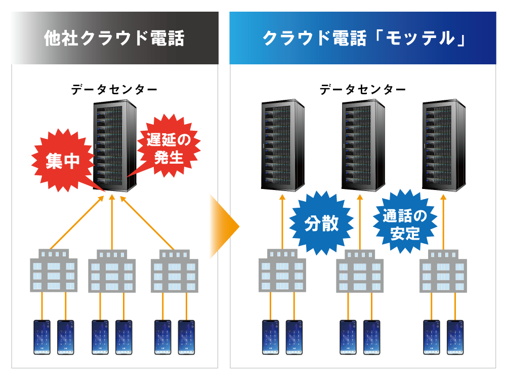 時間帯により全国から集中していた通話トラフィックを中国地方5県専用のクラウドデータセンターを開設し、分散することにより、いままで以上に安定した通話環境を確保できるようになります。