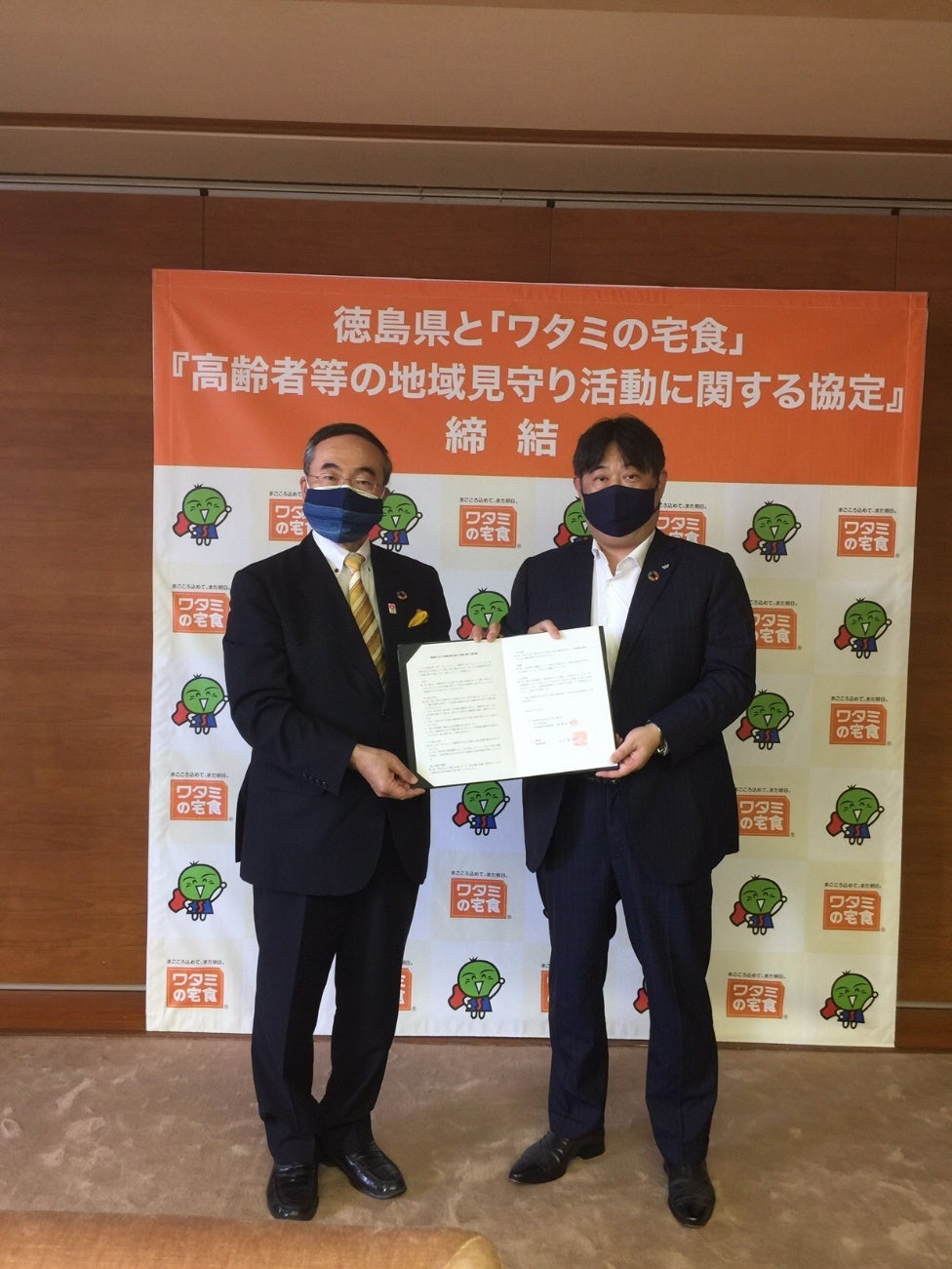 徳島県とワタミ株式会社(本社:東京都大田区、代表取締役社:渡邉 美樹、以下「ワタミ」)は、本日7月20日、「高齢者等の地域見守り活動に関する協定」を締結し、徳島県庁にて締結式を行いましたので、お知らせいたします。徳島県では、消費者行政新未来創造オフィスと連携し、全国展開を見据えたプロジェクトとして、消費生活上特に配慮を要する消費者(高齢者、障がい者等)を見守る「消費者安全確保地域協議会(見守りネットワーク)」の全県的な設置に取り組んでおります。県域の関係機関・団体が連携し、高齢者・障がい者等の見守り等必要な取組について、情報交換、協議を行うことにより、市町村における見守りネットワーク構築の機運醸成を図っています。ワタミは、2011年、徳島市内より宅食事業をスタートさせ、現在は4営業所で毎日約1,400食のお弁当・お惣菜をお届けしています。ワタミは全国各地の自治体と連携を深めることで、SDGs17の目標のうち