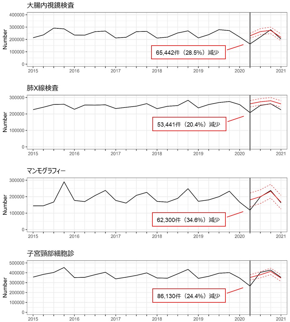 時系列分析(注3)という手法を用いて、パンデミック前の検査数の推移から、パンデミック後の検査数の予測(パンデミックがなかったと仮定した場合の検査数の予測値)と実際に観察された検査数の変化量を推定しました。以下、一部抜粋です。