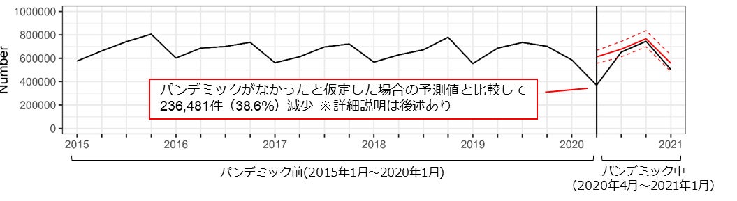 •赤枠:パンデミックがなかったと仮定した場合と比較した減少量。減少数は、赤線の件数を推定したモデルとは異なるモデルで推定したため、赤線と黒線の差分と減少件数は完全には一致しない。減少数は、自己回帰、移動平均、トレンド、季節変動を調整したうえでの変化量を表す。