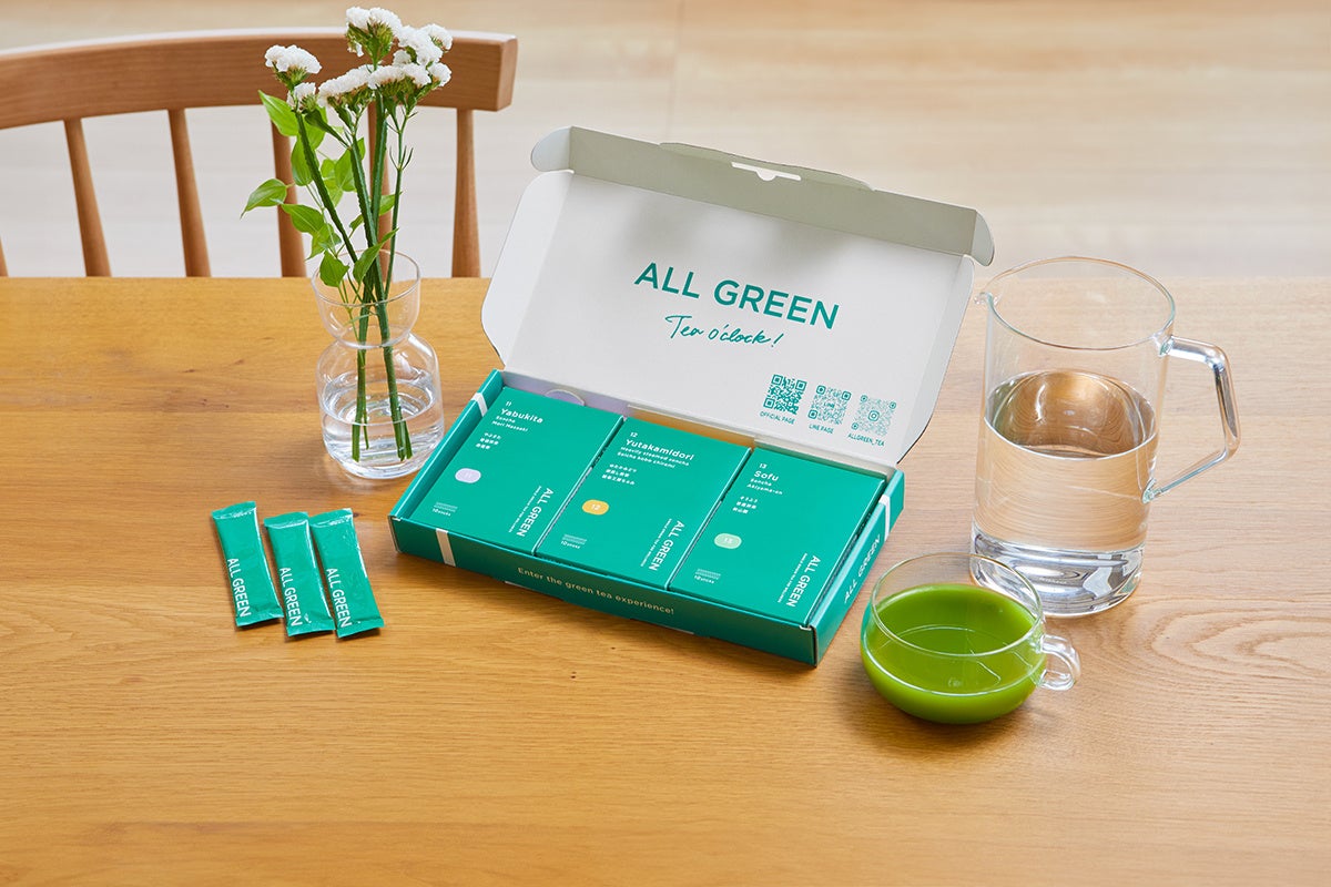 「ALL GREEN」は、希少なシングルオリジン・ティーを丸ごと粉砕し、おいしさや栄養を損なわない独自技術で溶けやすい粉末にした、丸ごと飲む緑茶です。