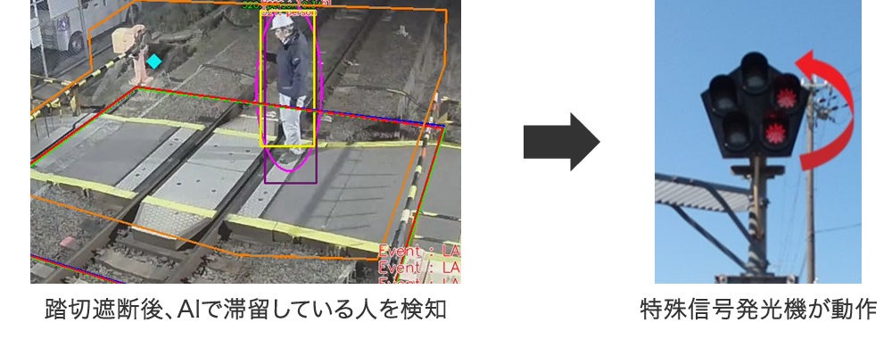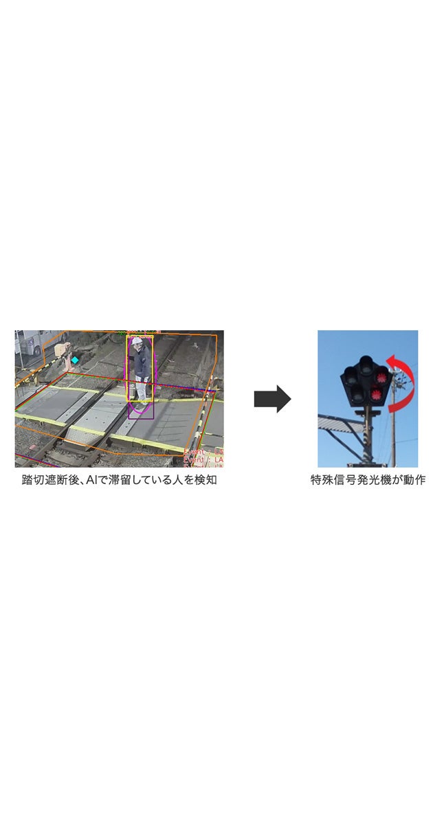 3. 検証内容:踏切に設置している監視カメラの映像をAIで分析し、踏切内の滞留を検知した際には特殊信号発光機と連動して、踏切に接近する列車の運転士に停止信号で知らせる機能を検証