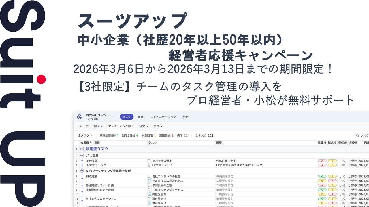 株式会社スーツ(所在地:東京都千代田区、代表取締役社長CEO:小松 裕介)は、AIタスク管理・プロジェクト管理ツール「スーツアップ」において、中小企業(社歴20年以上50年以内)経営者応援キャンペーンを実施いたします。