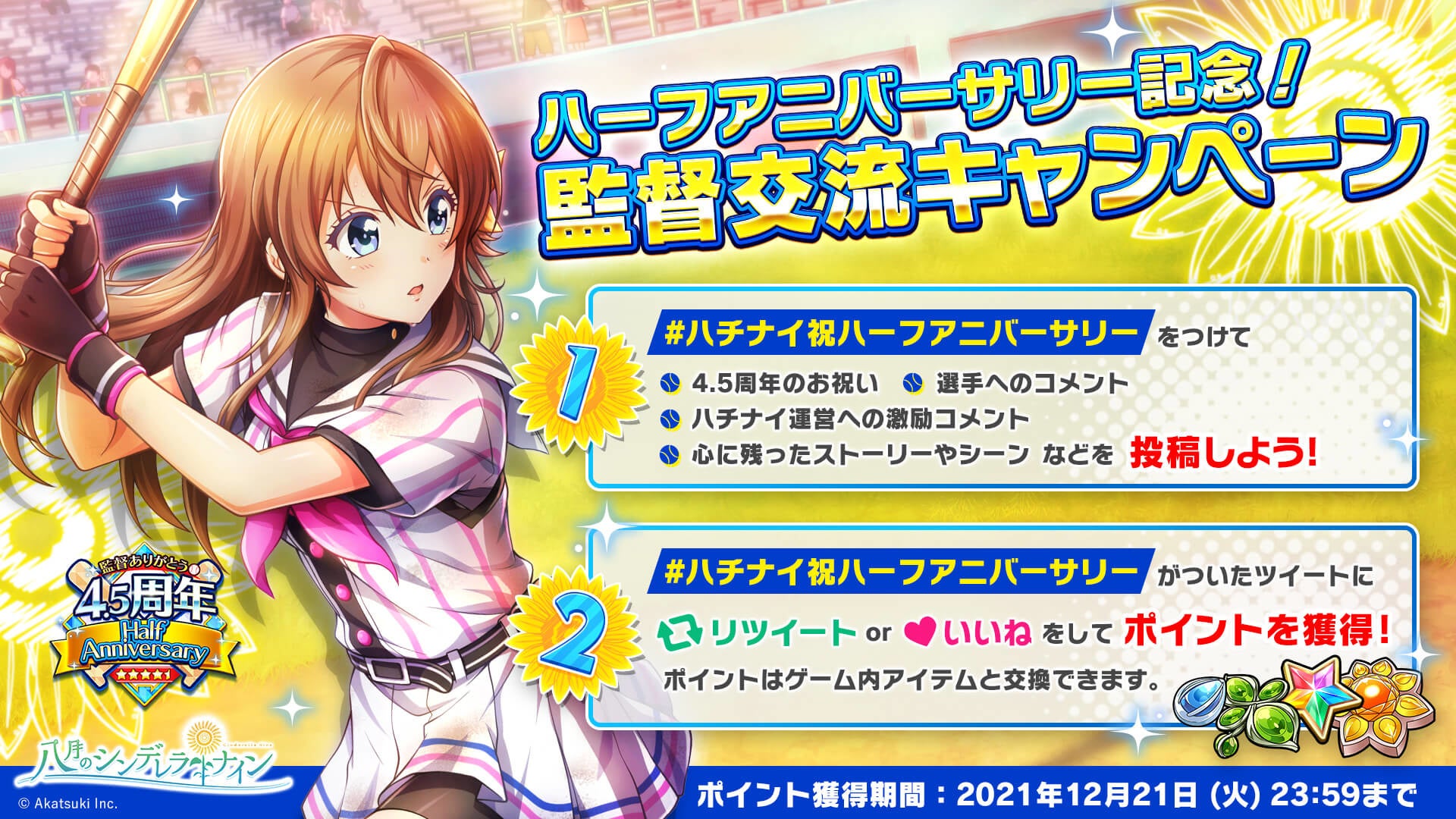 ・「#ハチナイ祝ハーフアニバーサリー」をつけてのツイートを大募集いたします。4.5周年のお祝いコメントや選手へのメッセージなど、たくさんのご投稿をお待ちしています。